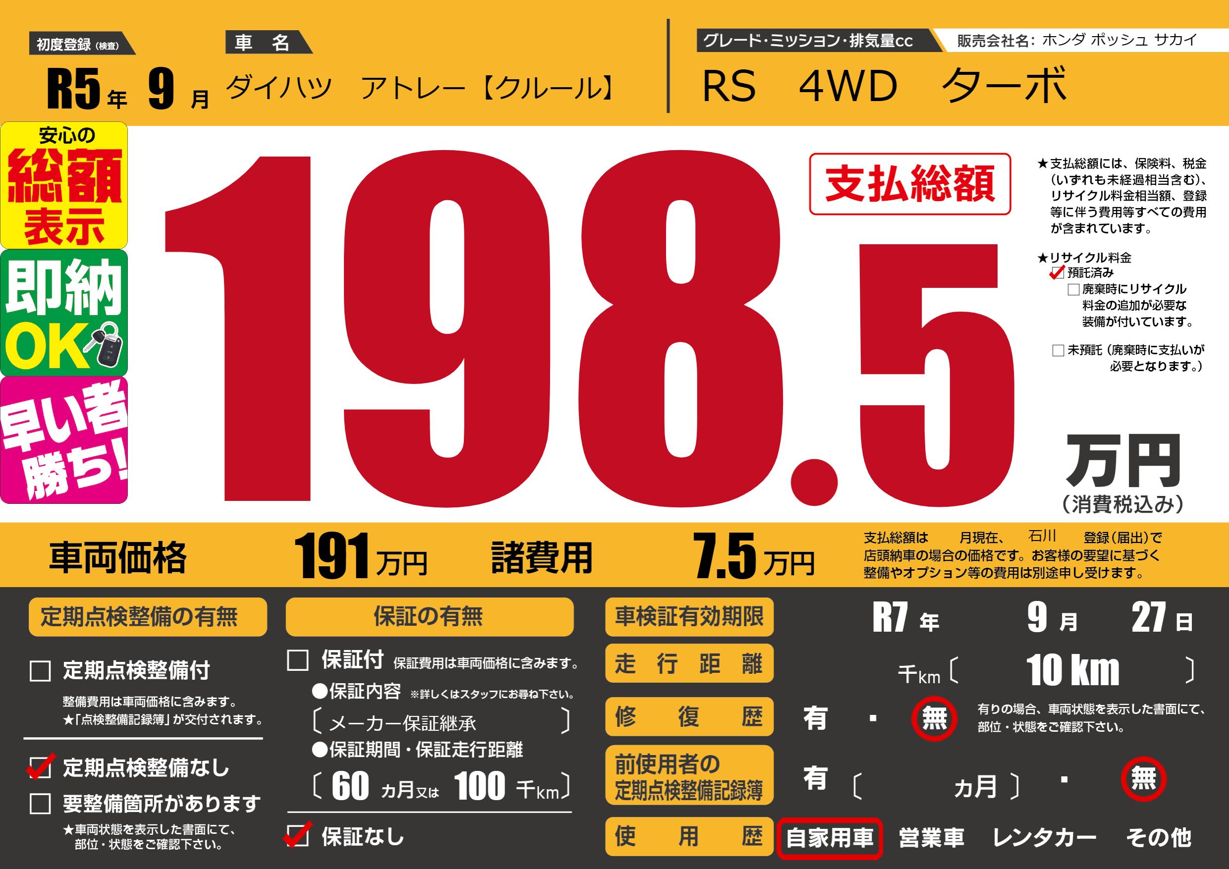 | 走行キロ | - | 初年度登録 | R5年9月 |