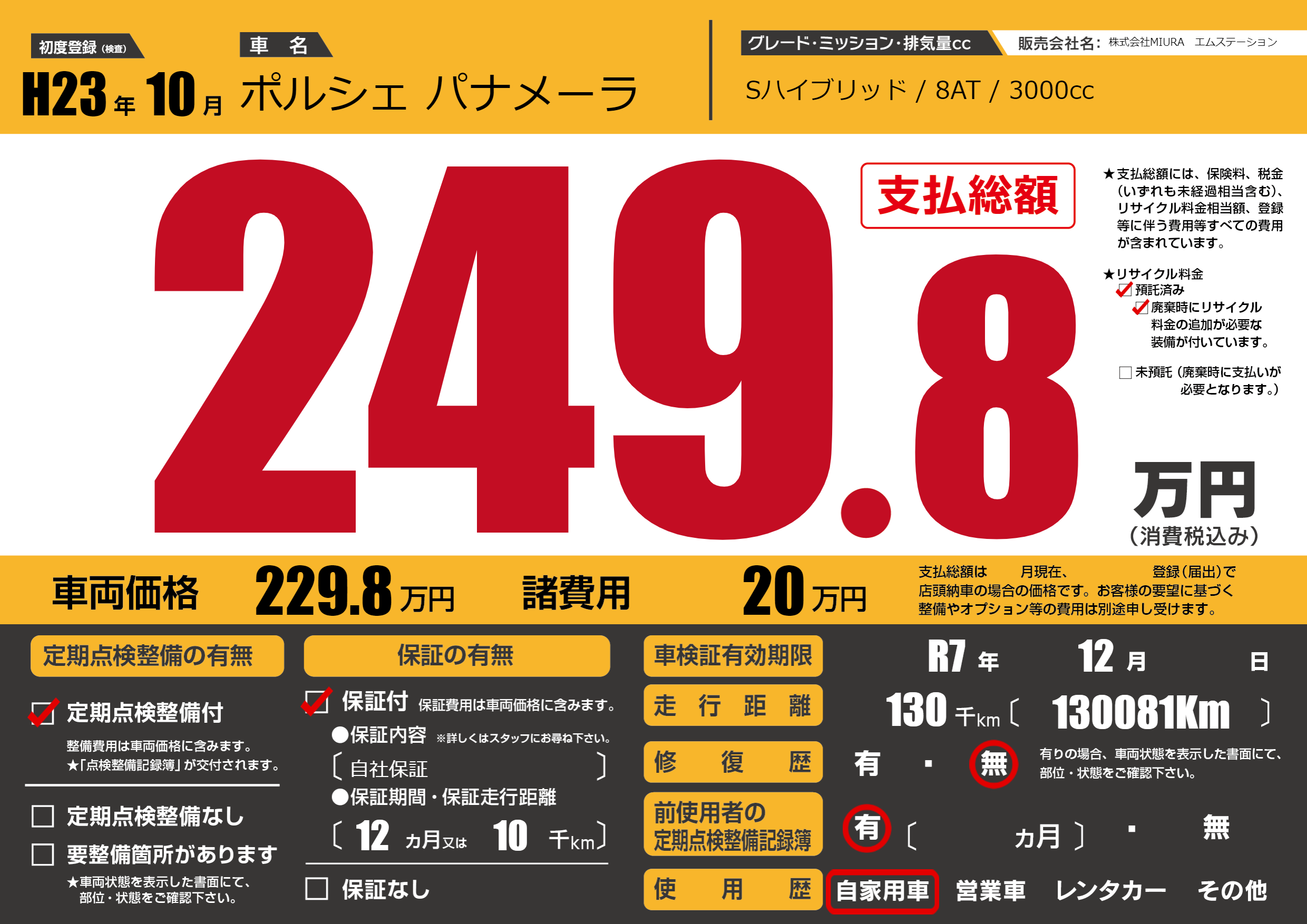 | 車名 | ポルシェ パナメーラ | グレード ミッション 排気量 |
