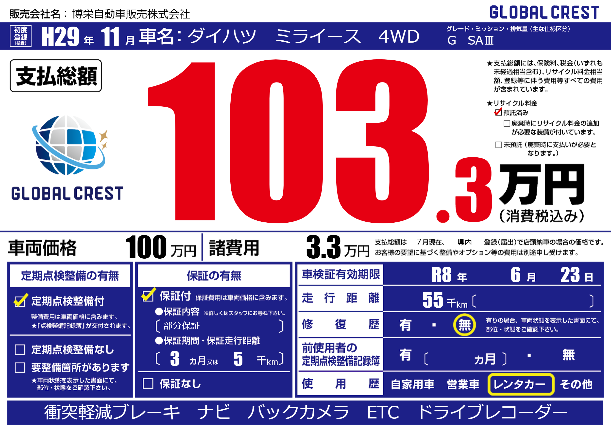 | 車名 | ダイハツ ミライース 4WD | グレード ミッション 排気量 |