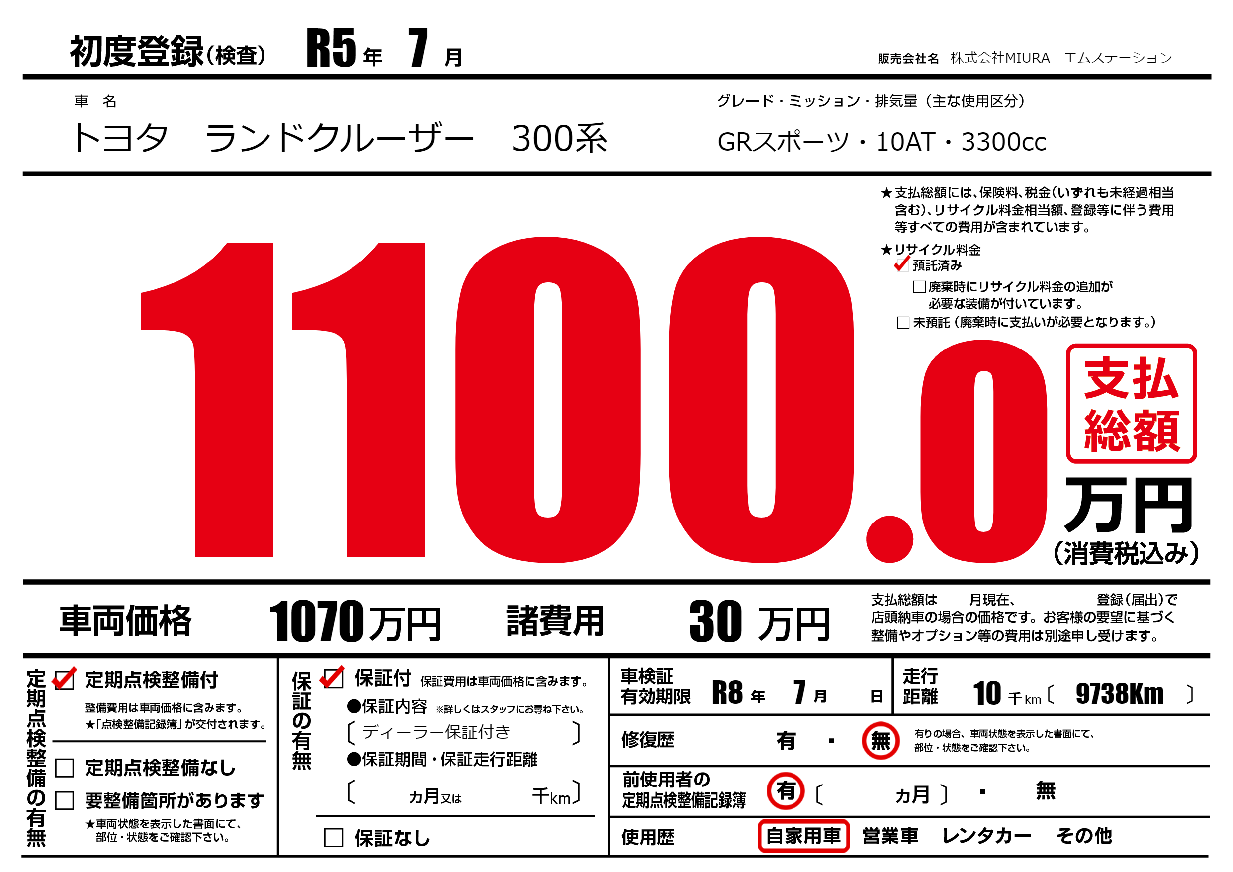 | 車名 | トヨタ ランドクルーザー 300系 | グレード ミッション 排気量 |
