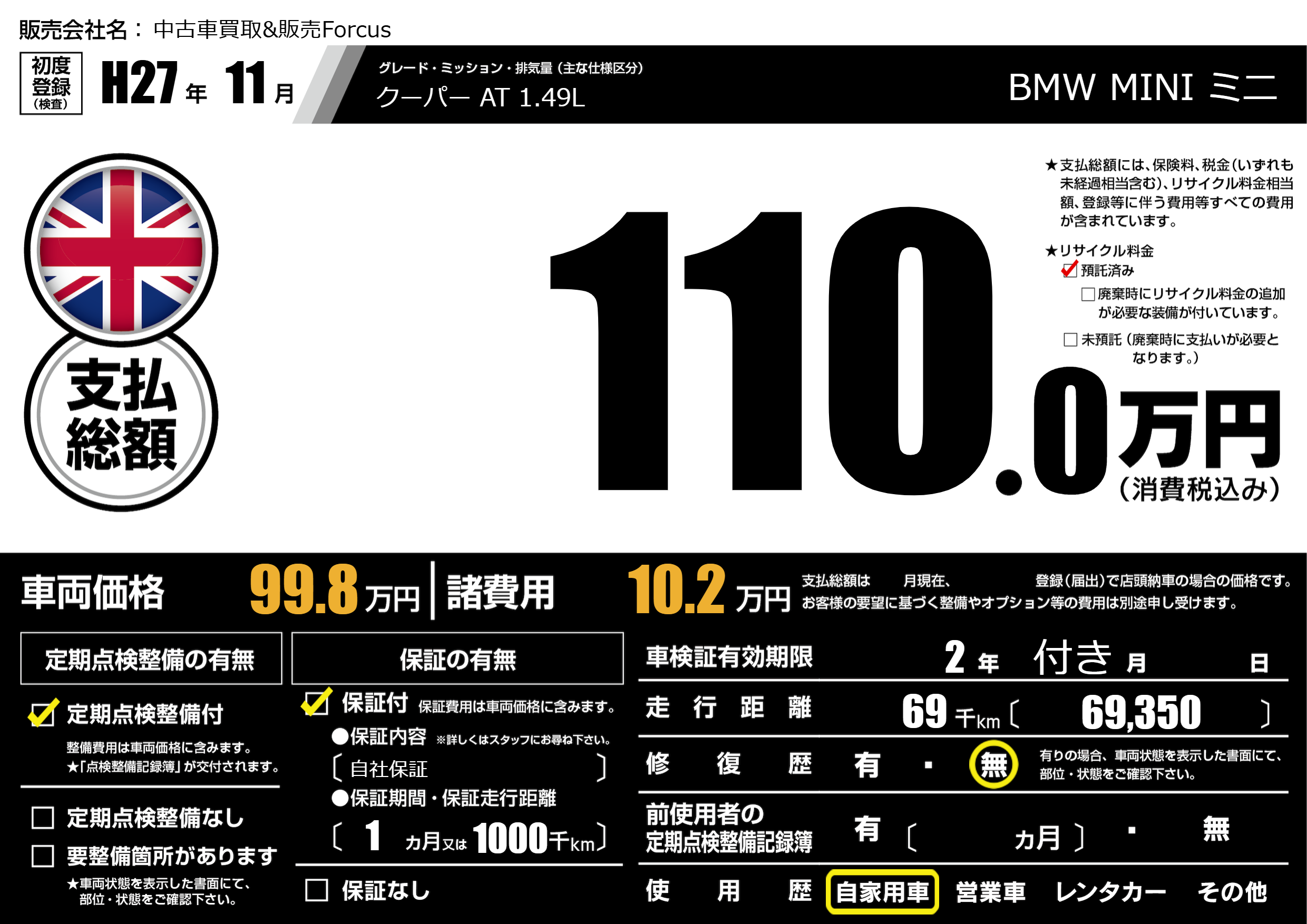 | 車名 | BMW MINI ミニ | グレード ミッション 排気量 |