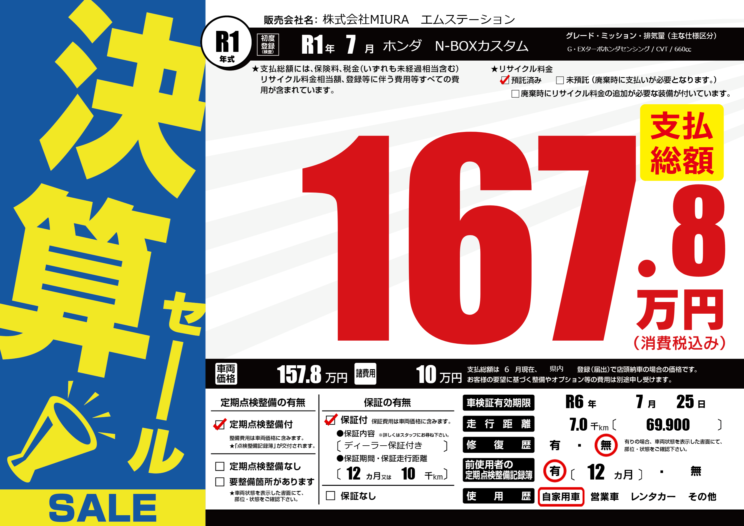 | 走行キロ | 0.7万km | 初年度登録 | R1年7月 |
