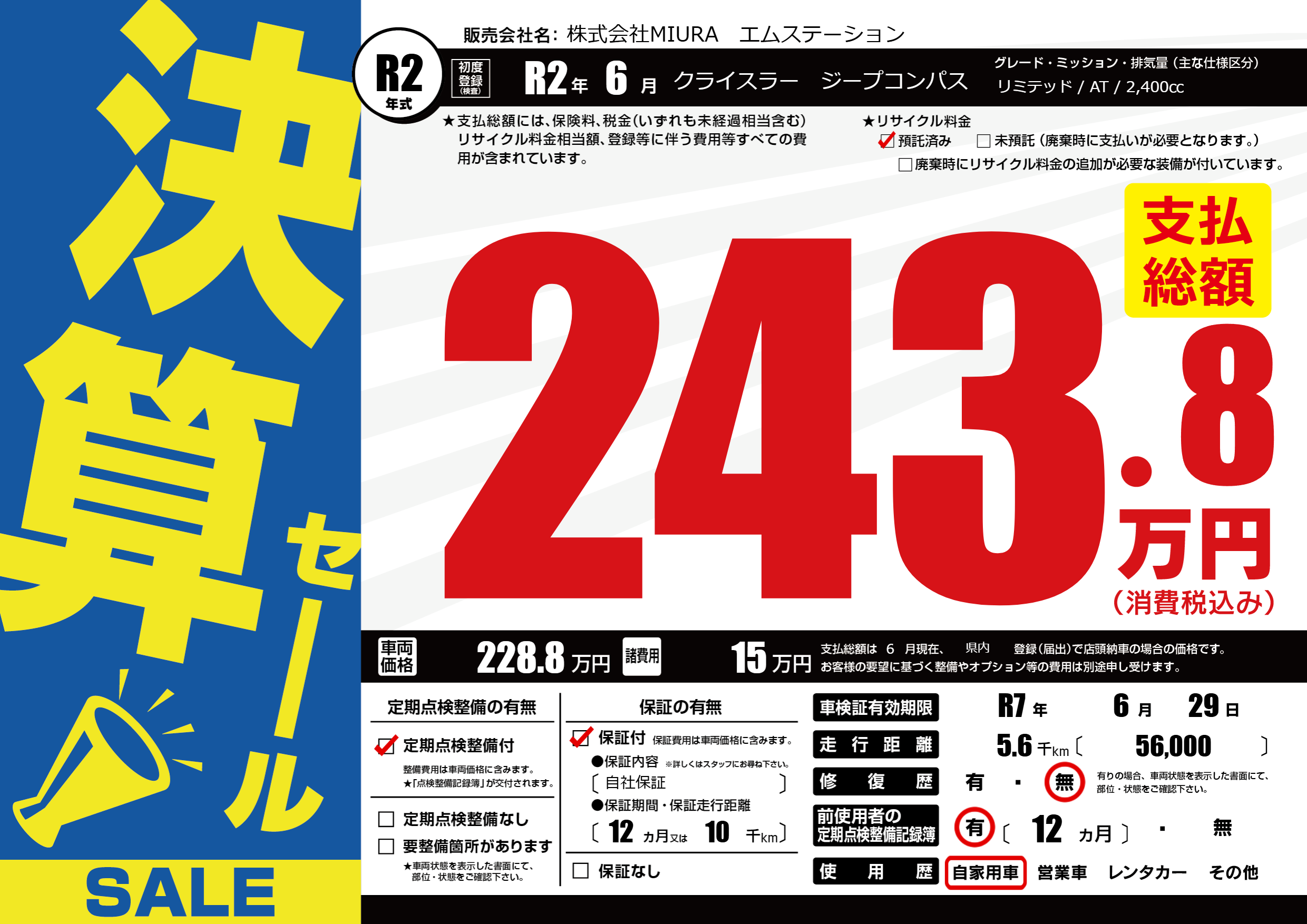 | 車名 | クライスラー ジープコンパス | グレード ミッション 排気量 |