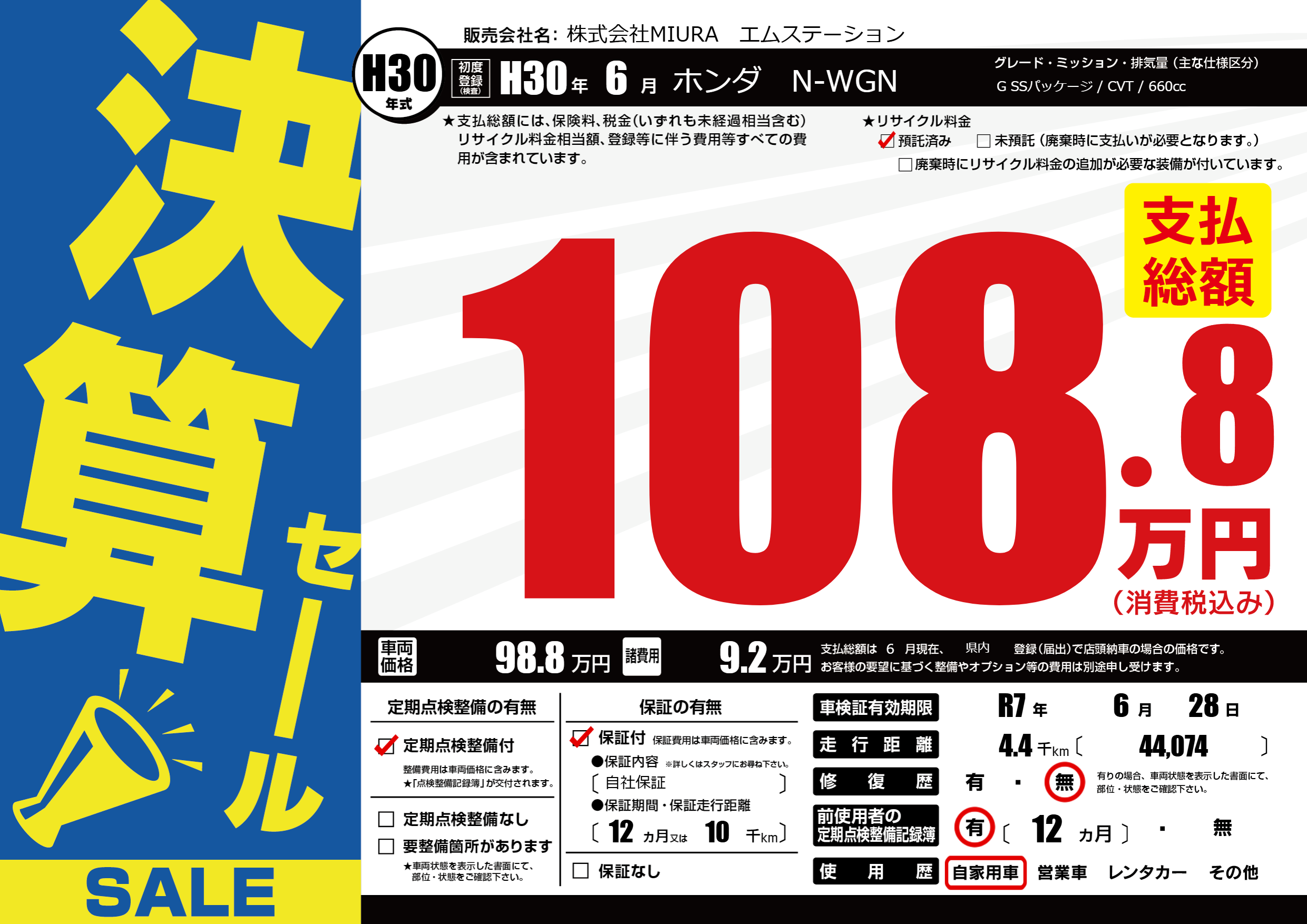 | 車検制限 | R7年 6月 28日 | ||
