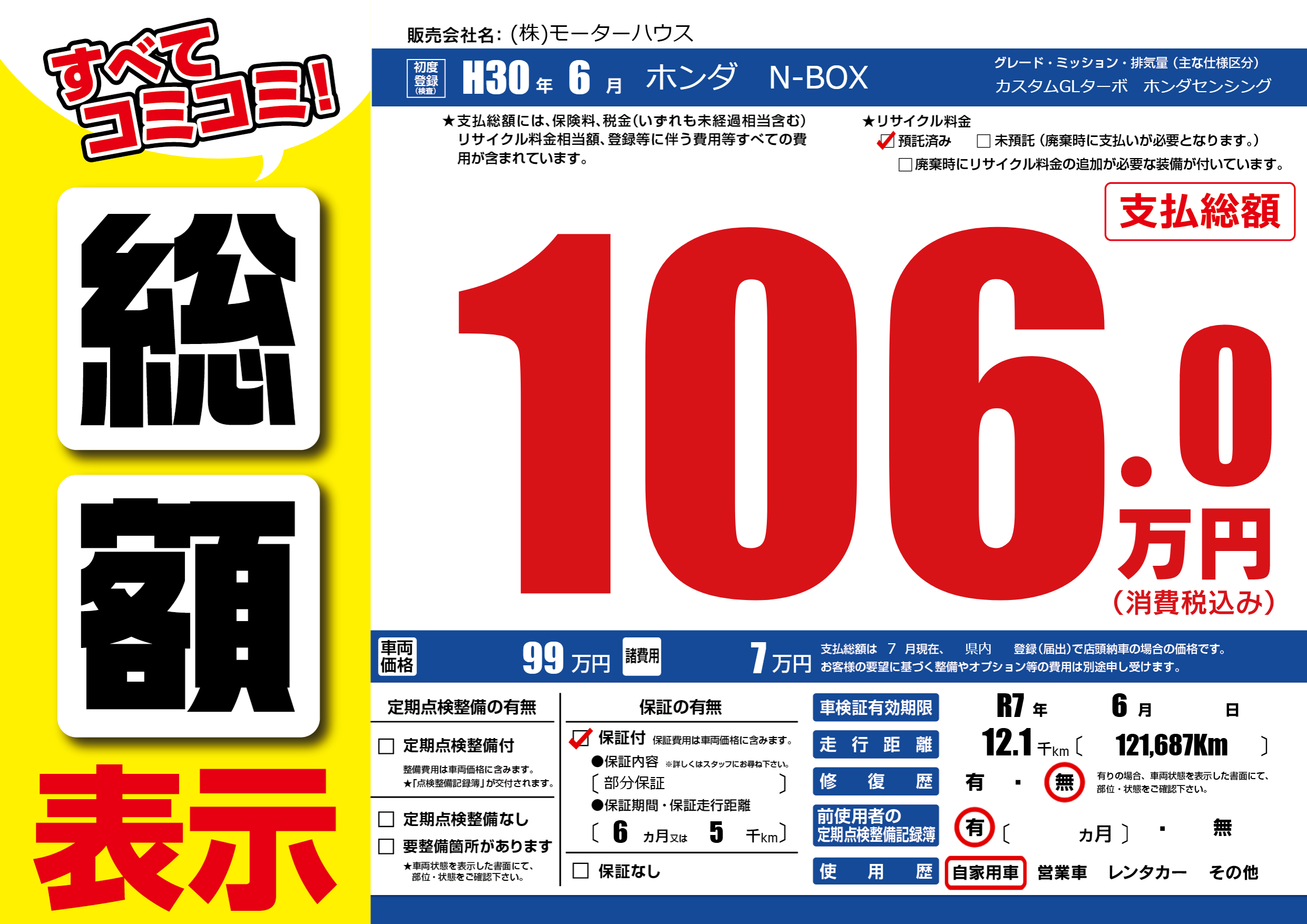 | 車名 | ホンダ N-BOX | グレード ミッション 排気量 |