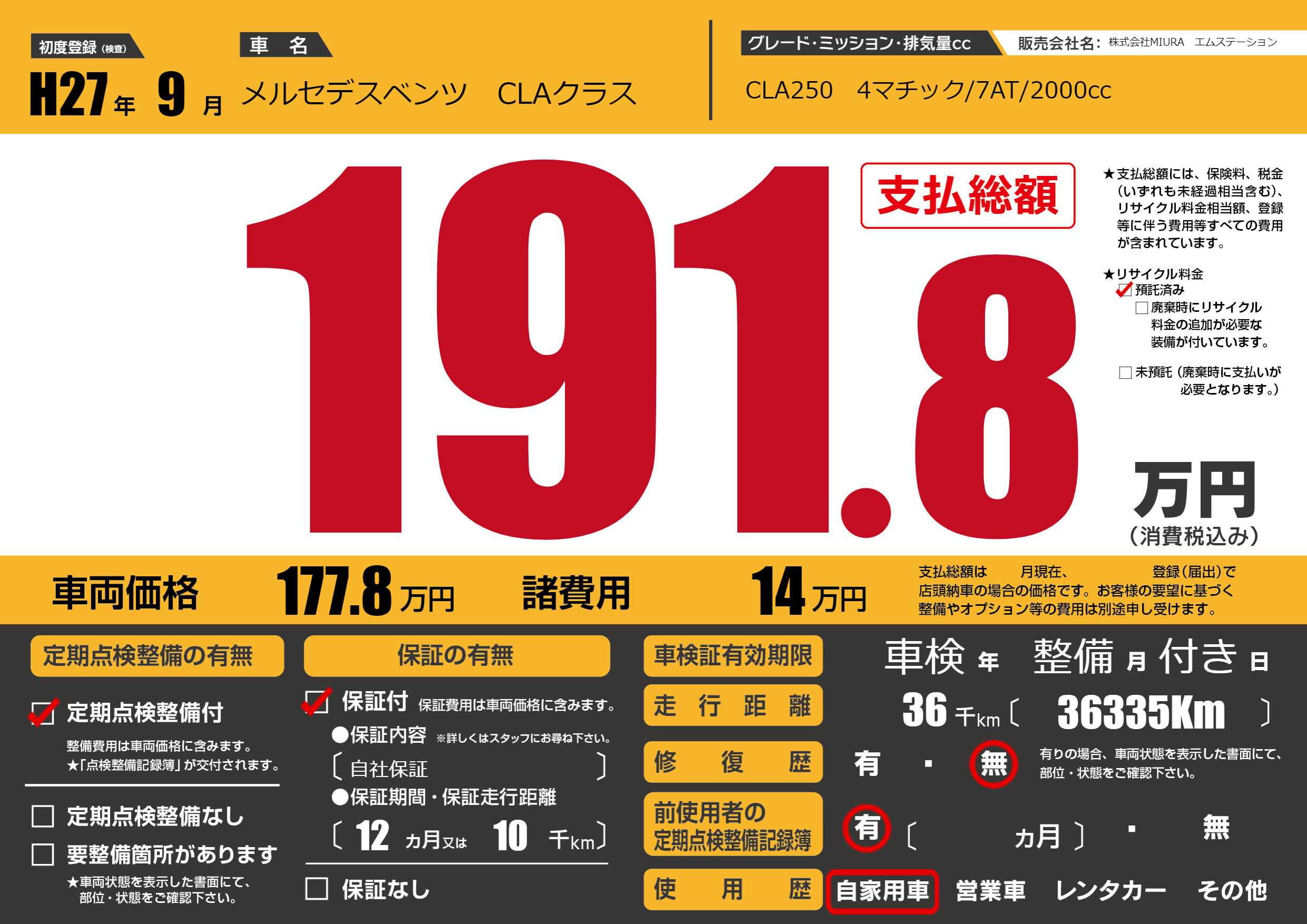 | 車名 | メルセデスベンツ CLAクラス | グレード ミッション 排気量 |