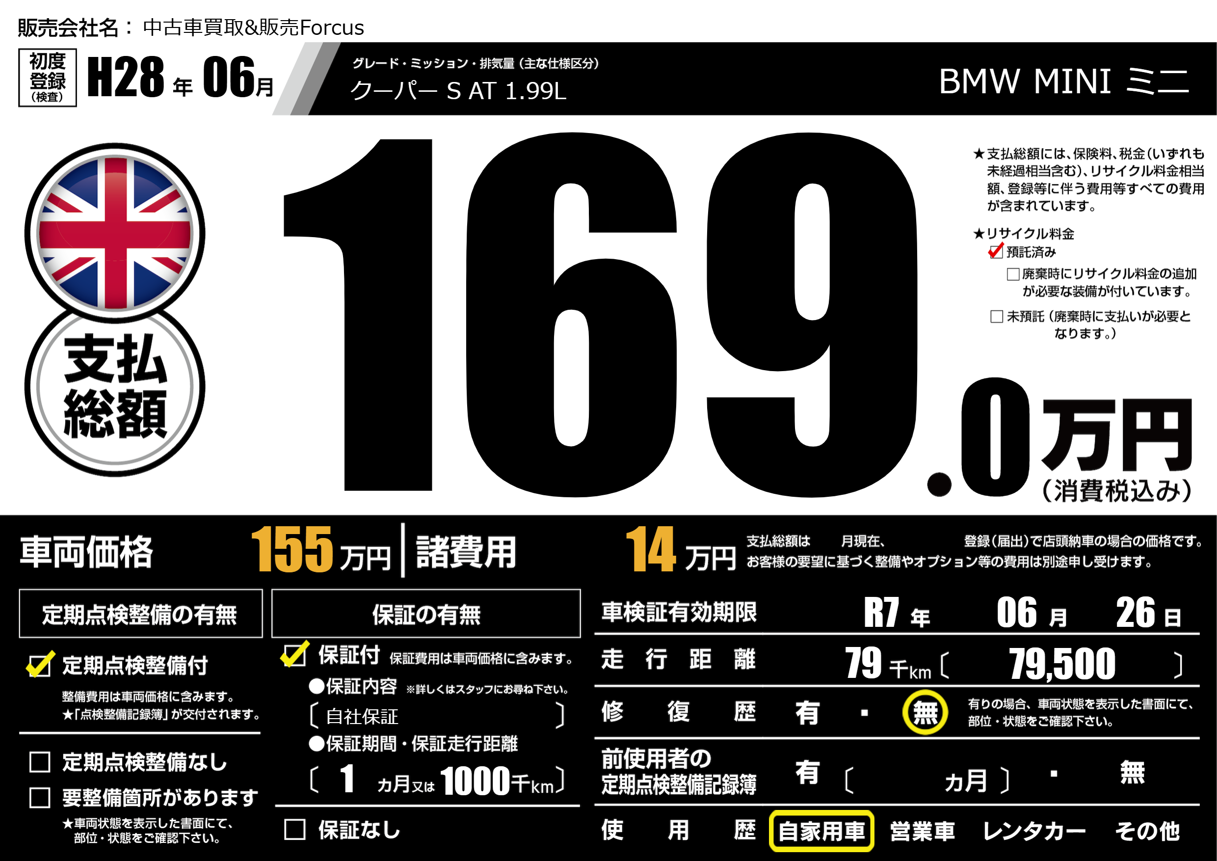 | 車名 | BMW MINI ミニ | グレード ミッション 排気量 |