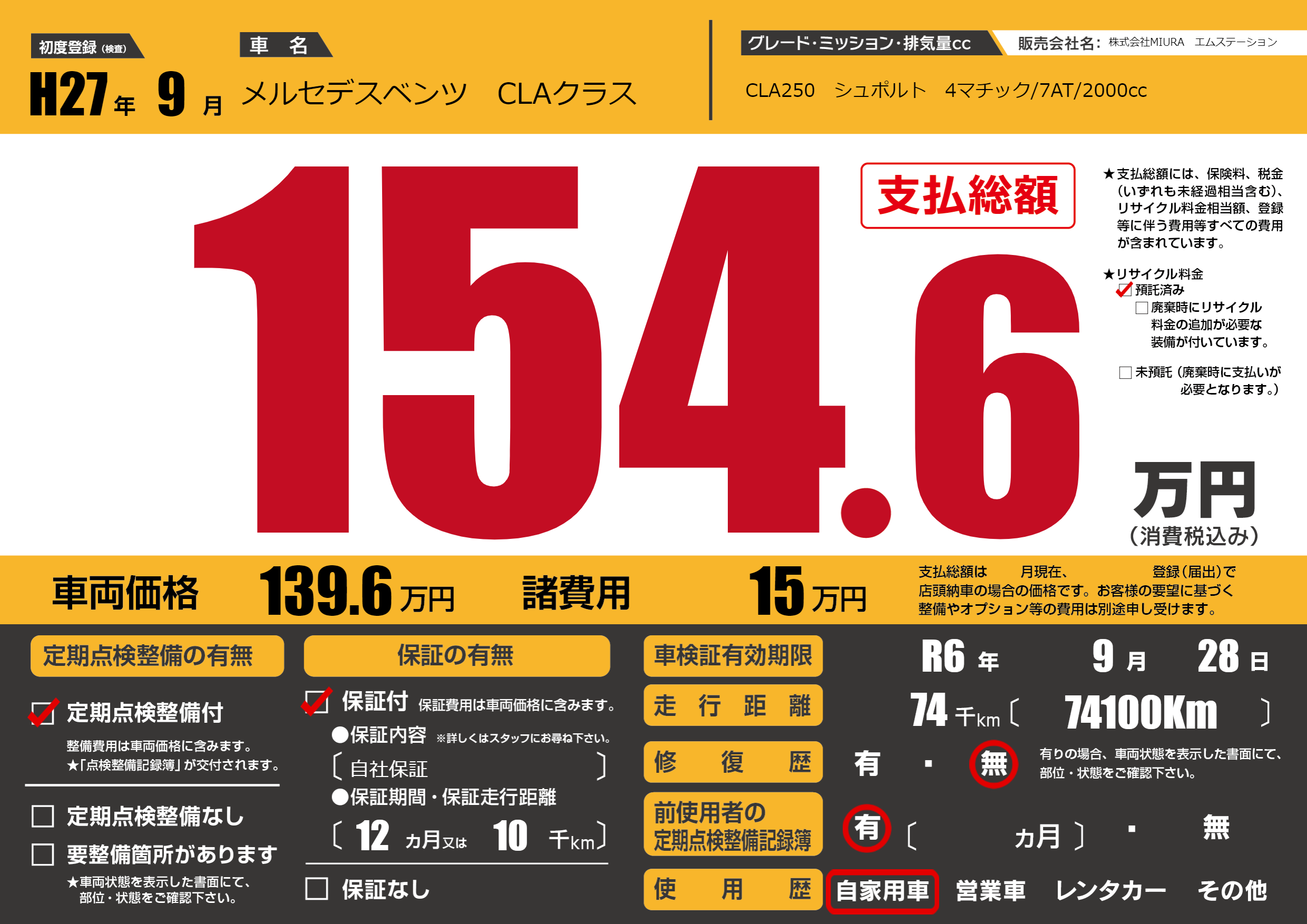 | 車名 | メルセデスベンツ CLAクラス | グレード ミッション 排気量 |