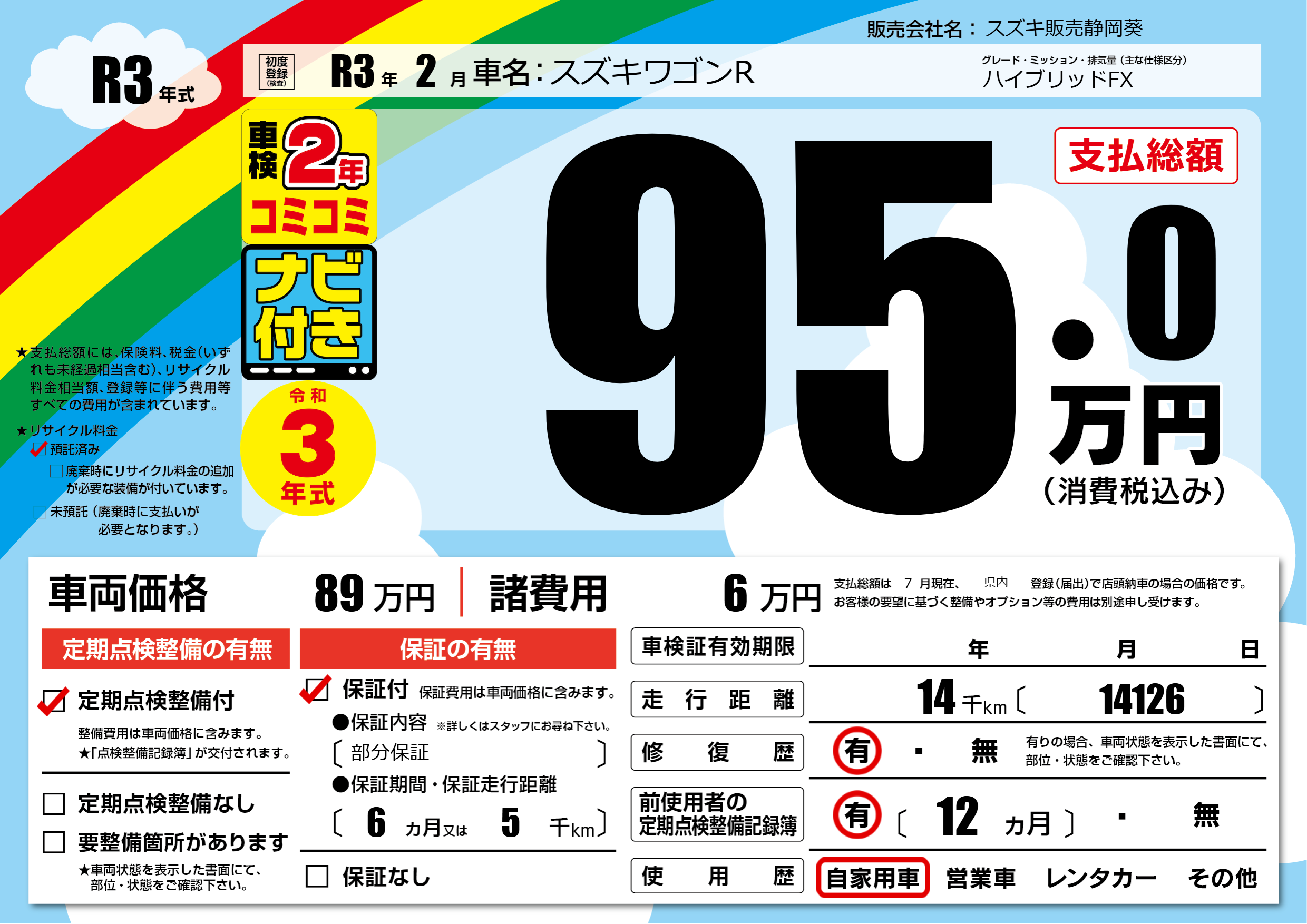 | 車名 | スズキワゴンR | グレード ミッション 排気量 |