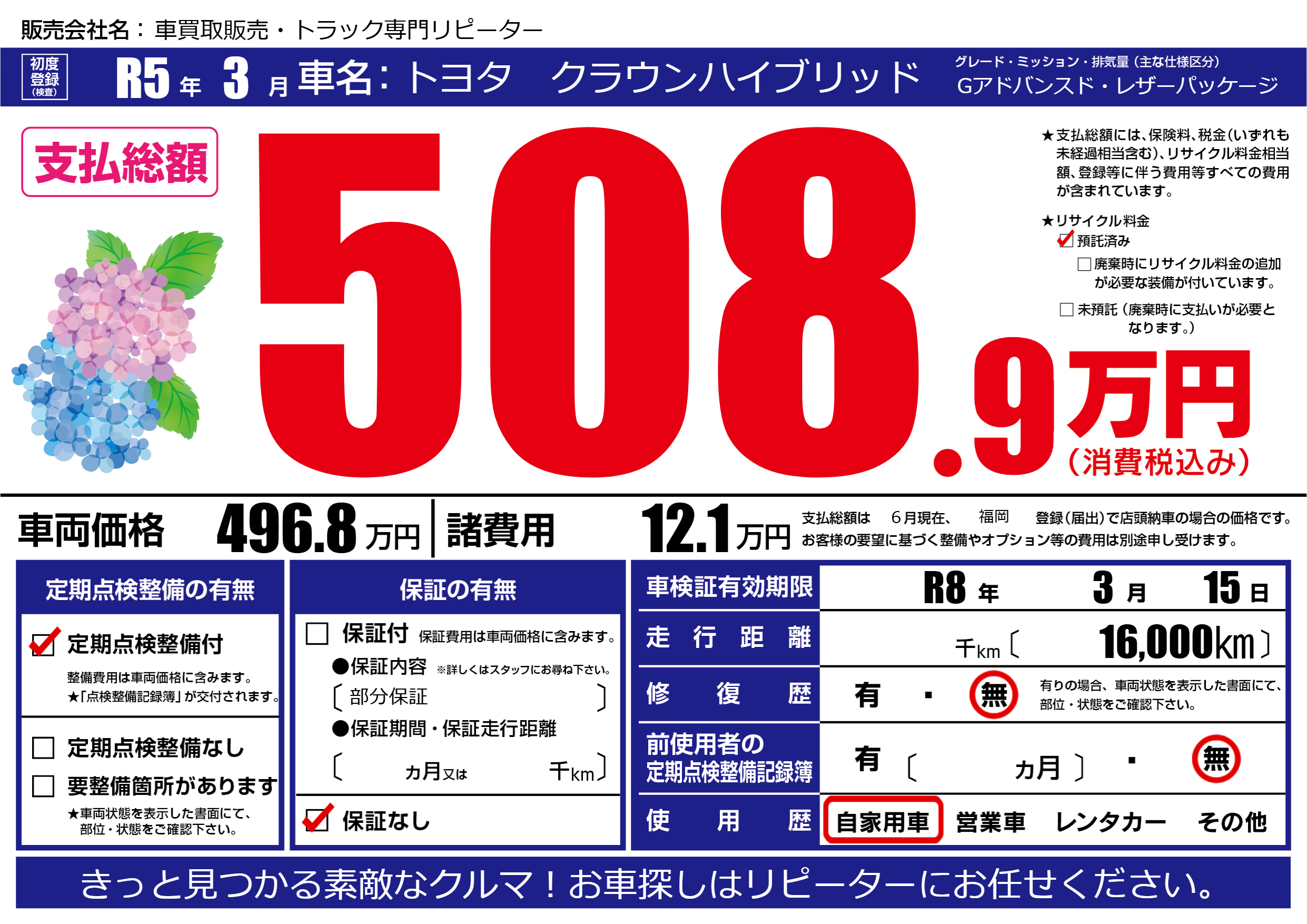 | 車名 | トヨタ クラウンハイブリッド | グレード ミッション 排気量 |
