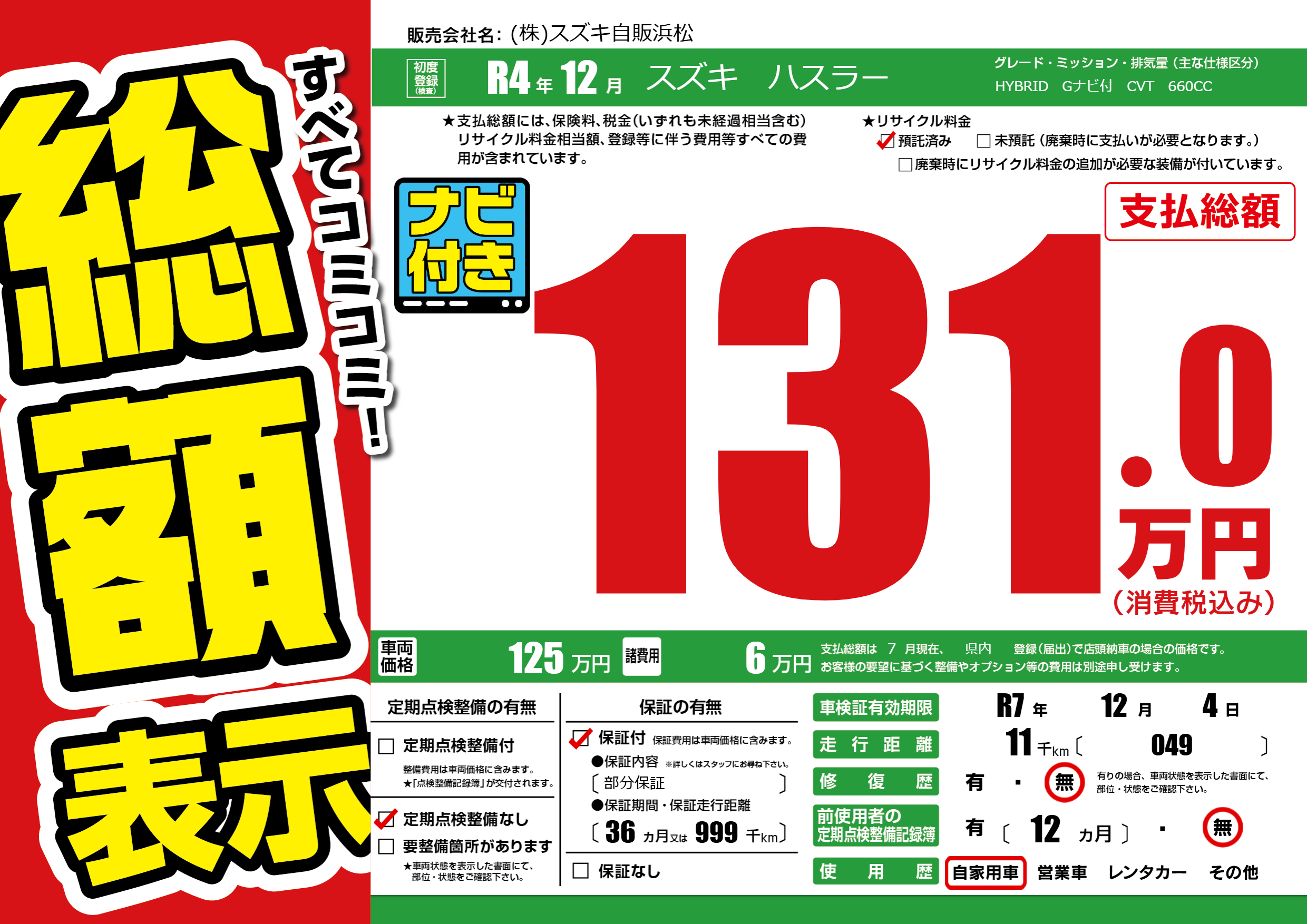 | 車名 | スズキ ハスラー | グレード ミッション 排気量 |