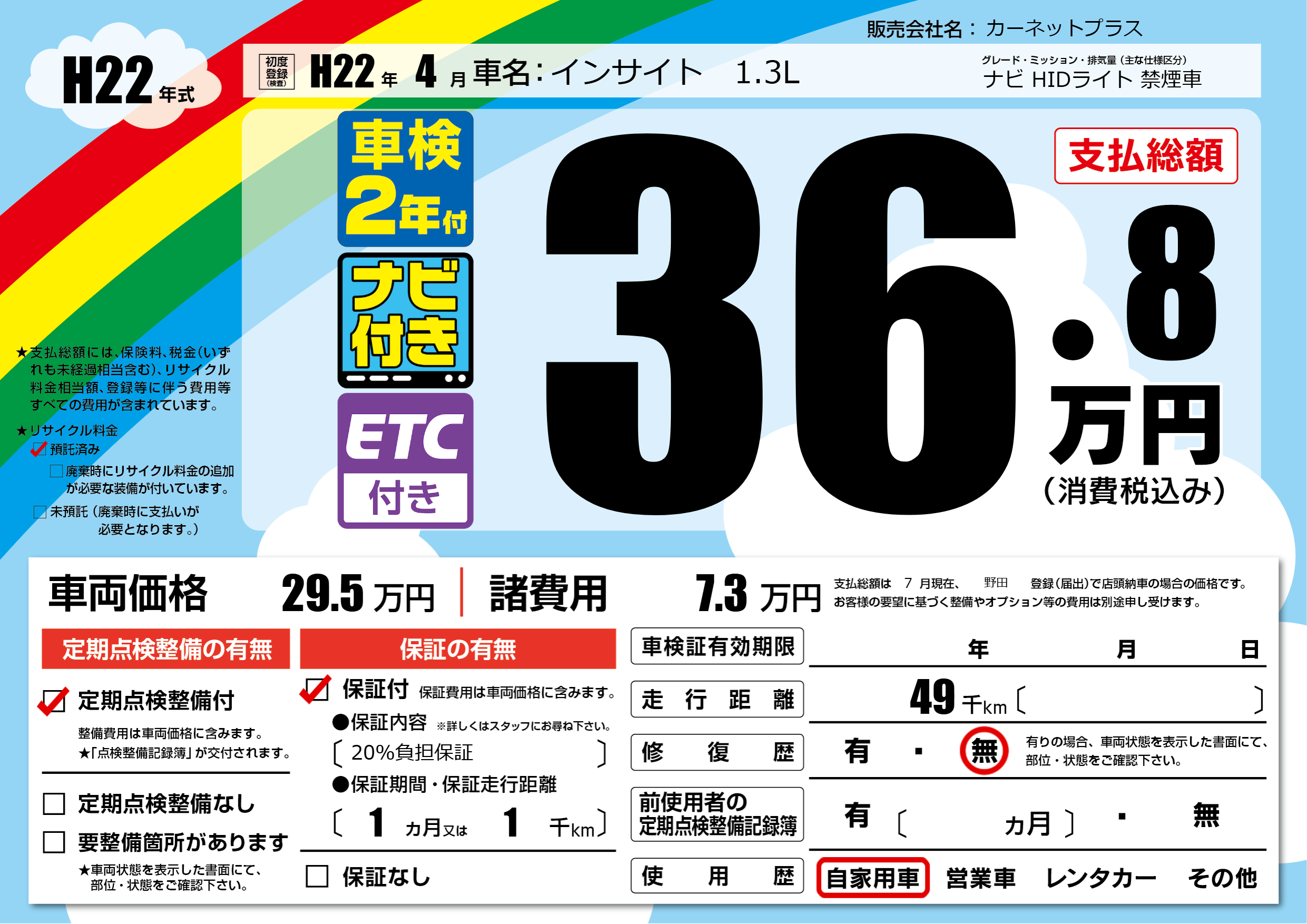 | 車名 | インサイト 1.3L | グレード ミッション 排気量 |