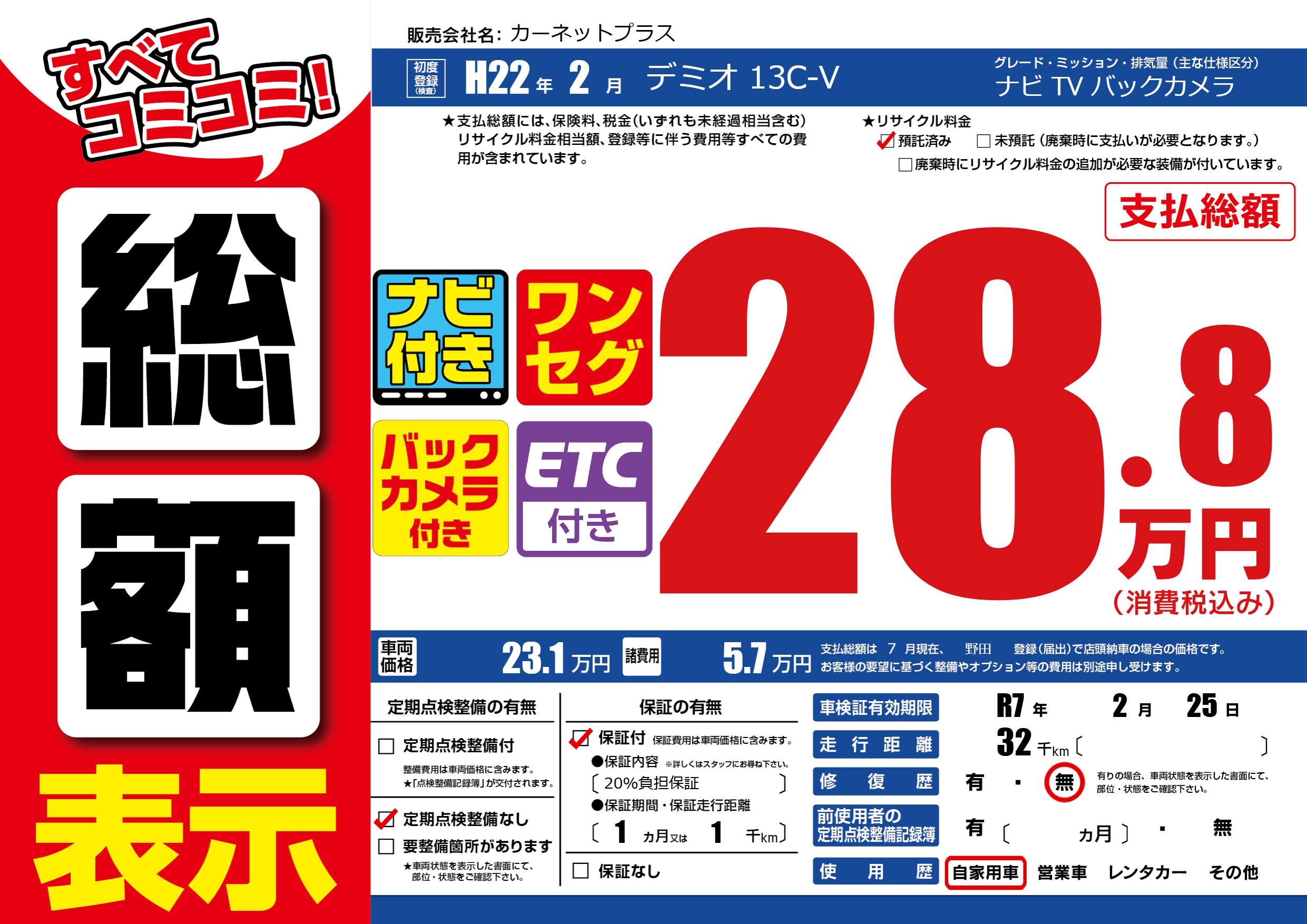 | 車名 | デミオ 13C-V | グレード ミッション 排気量 |
