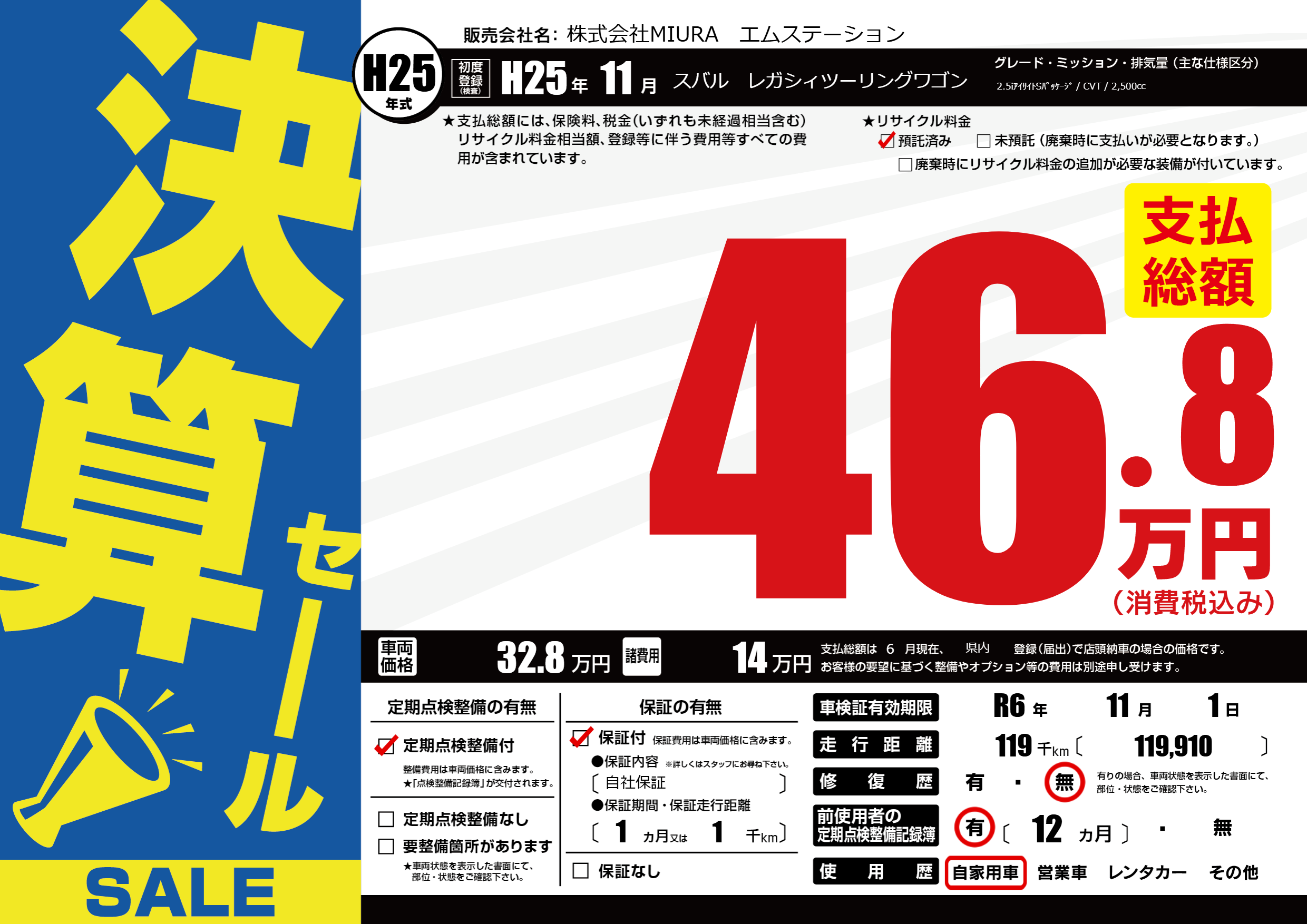 | 車名 | スバル レガシィツーリングワゴン | グレード ミッション 排気量 |