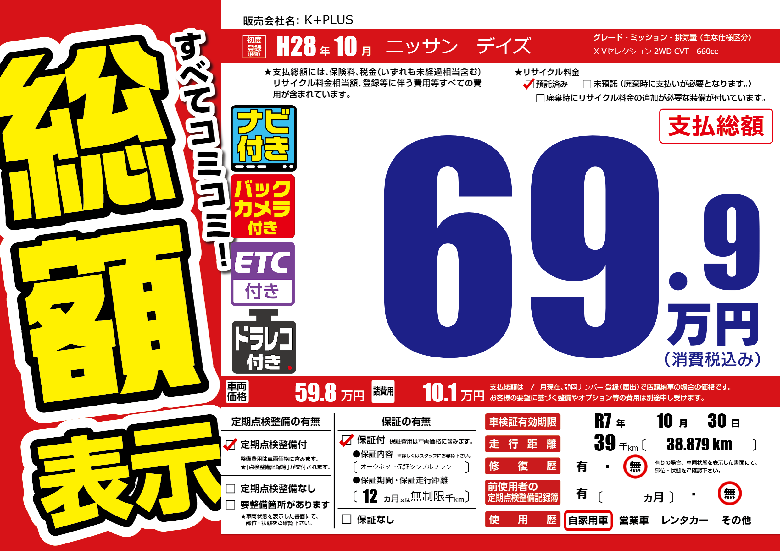 | 車名 | ニッサン デイズ | グレード ミッション 排気量 |
