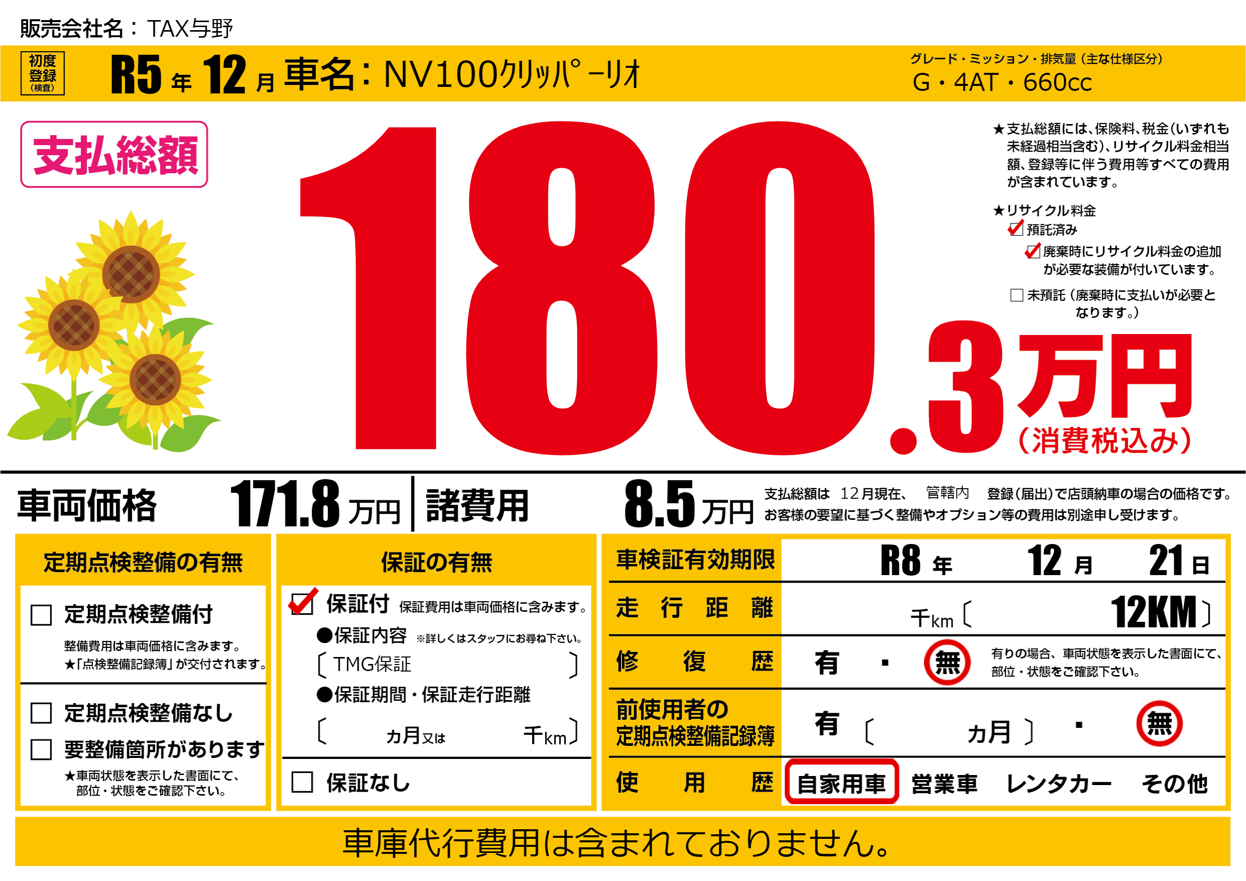 保証付き 保証内容(TMG保証) ---ヶ月または()千kmまで |