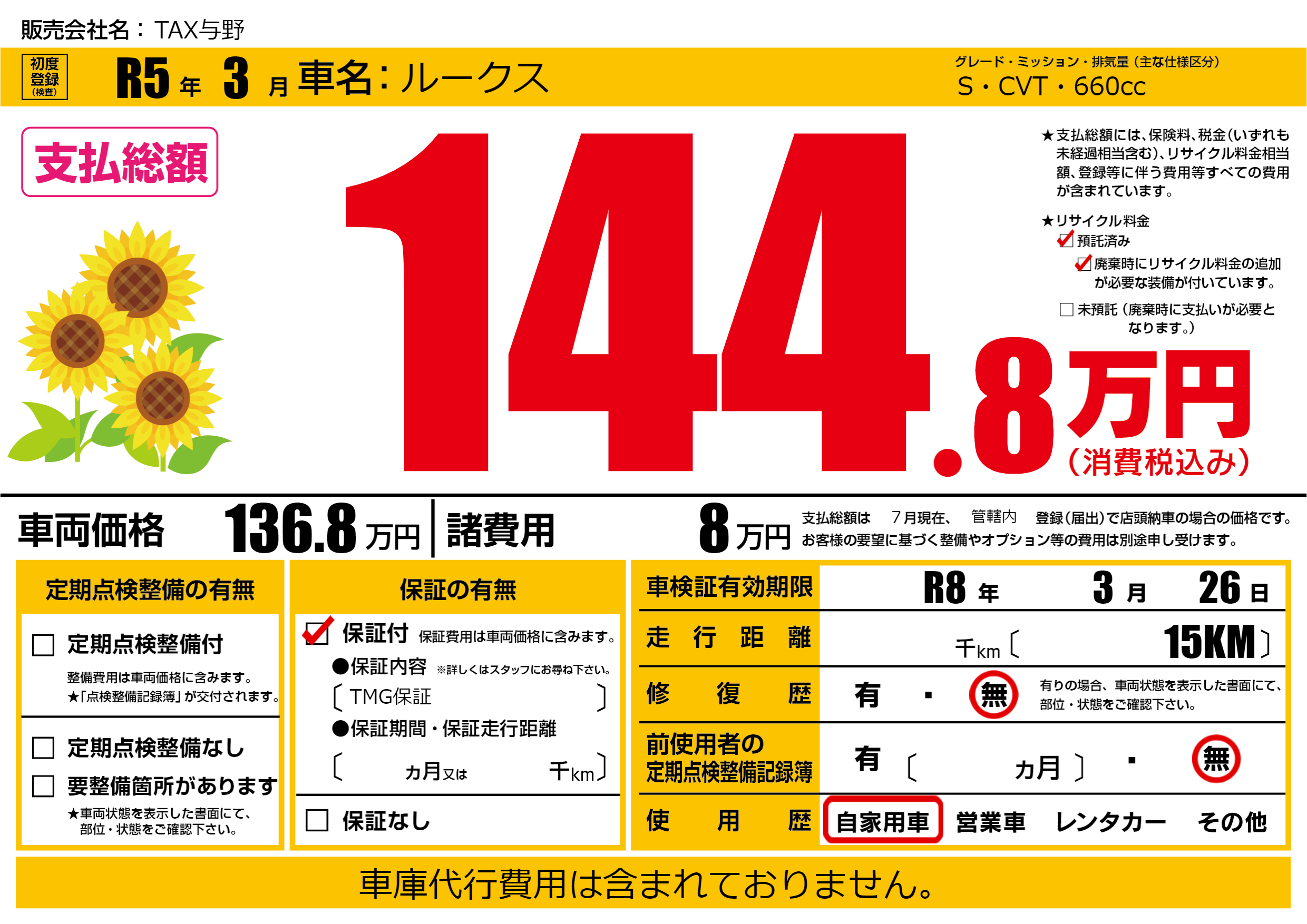 保証付き 保証内容(TMG保証) ---ヶ月または()千kmまで |