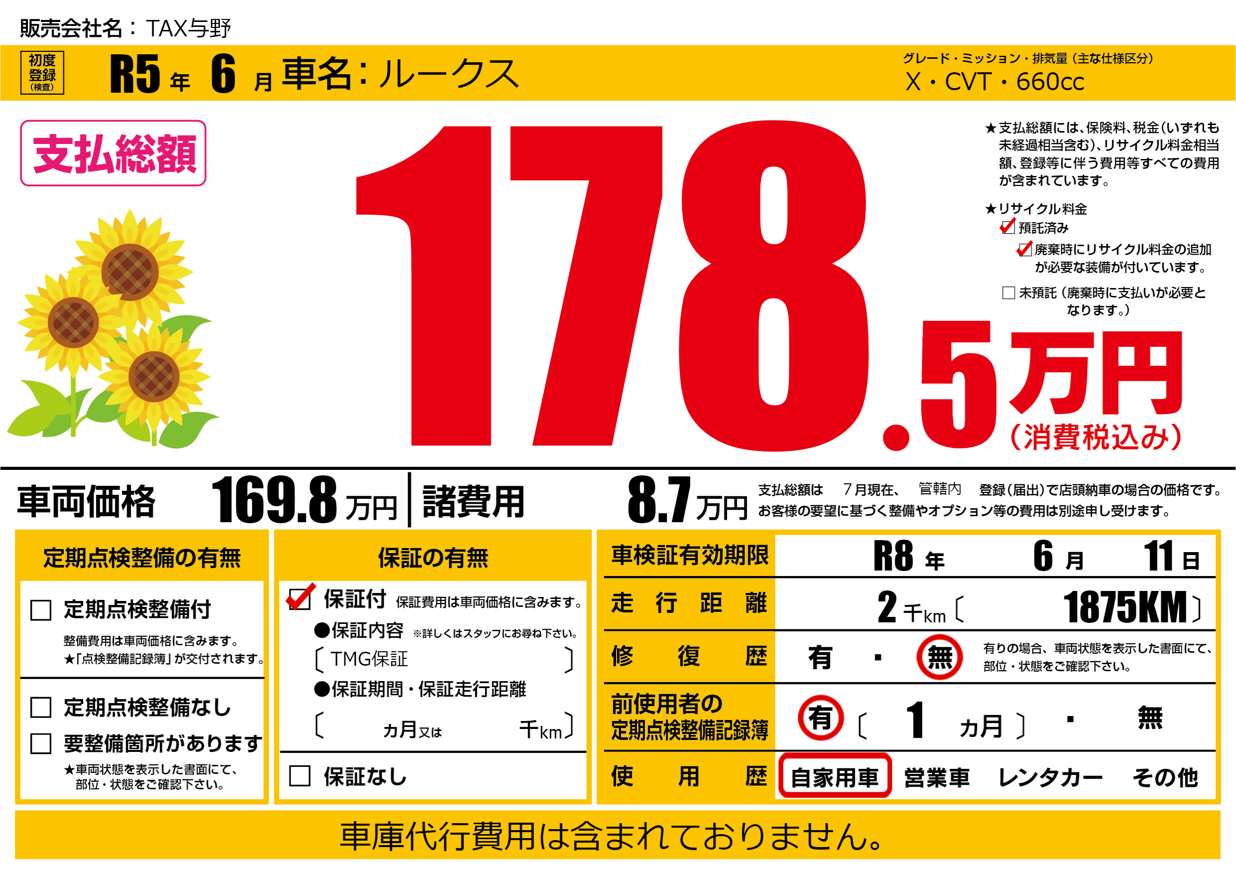 保証付き 保証内容(TMG保証) ---ヶ月または()千kmまで |