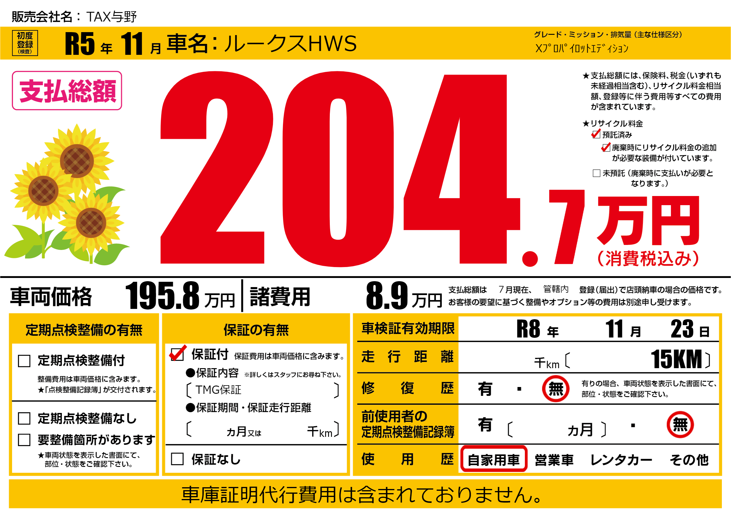 | 走行キロ | - | 初年度登録 | R5年11月 |