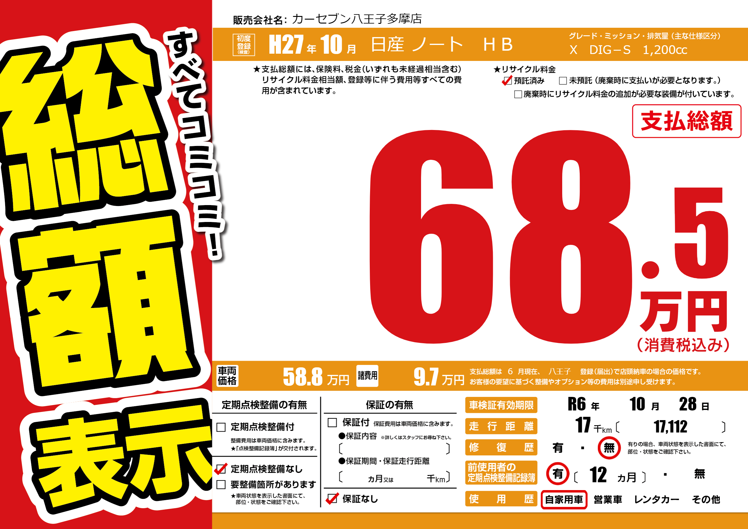 | 車名 | 日産 ノート HB | グレード ミッション 排気量 |
