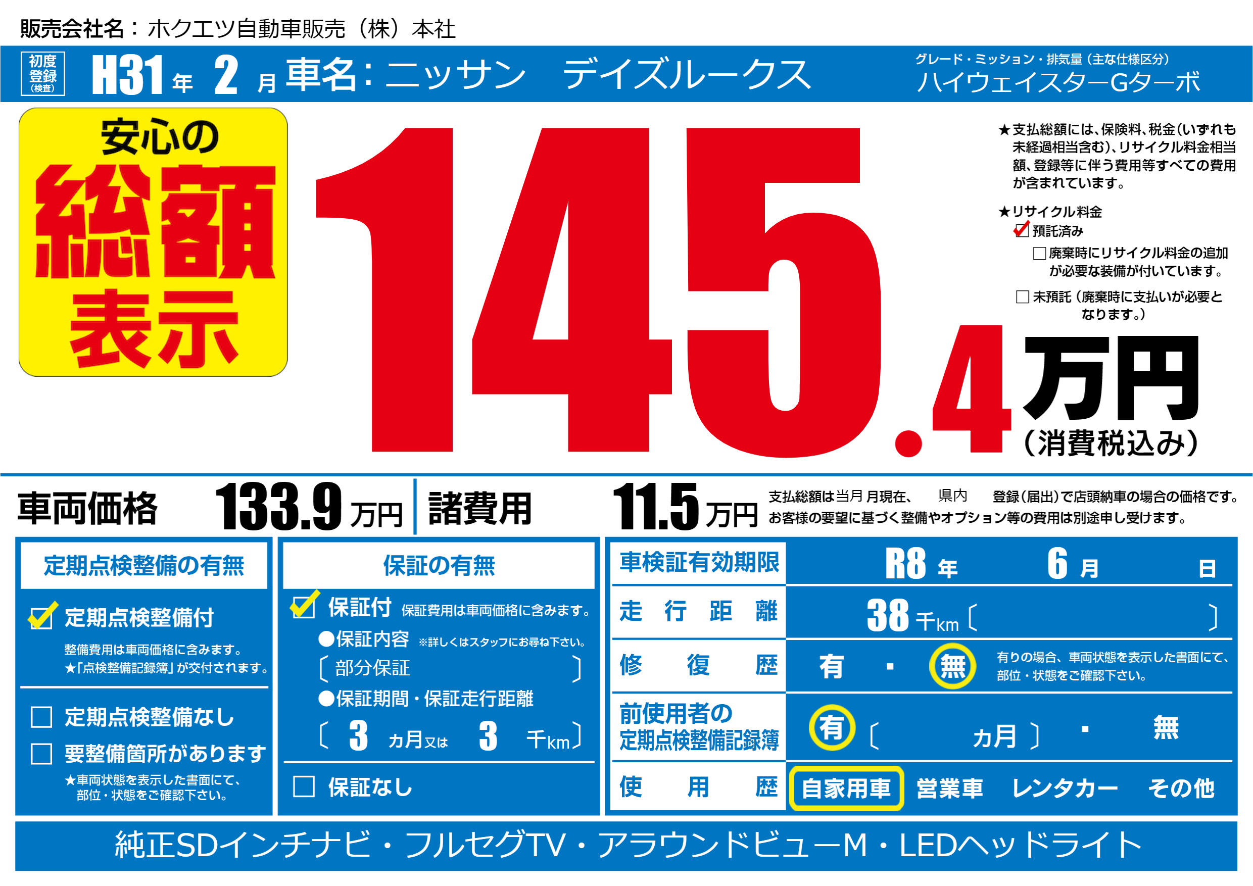 | 車名 | ニッサン デイズルークス | グレード ミッション 排気量 |