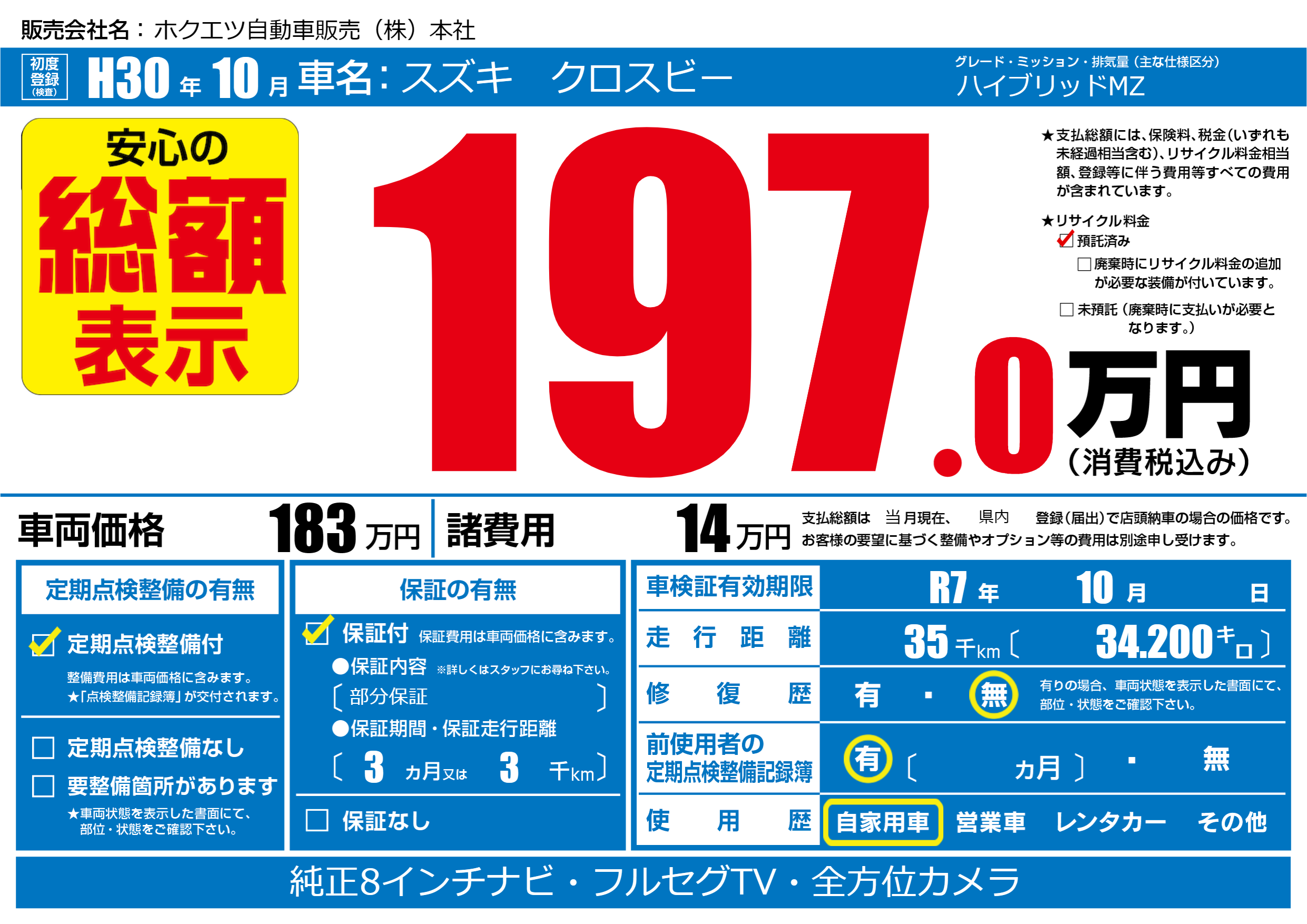 | 車名 | スズキ クロスビー | グレード ミッション 排気量 |