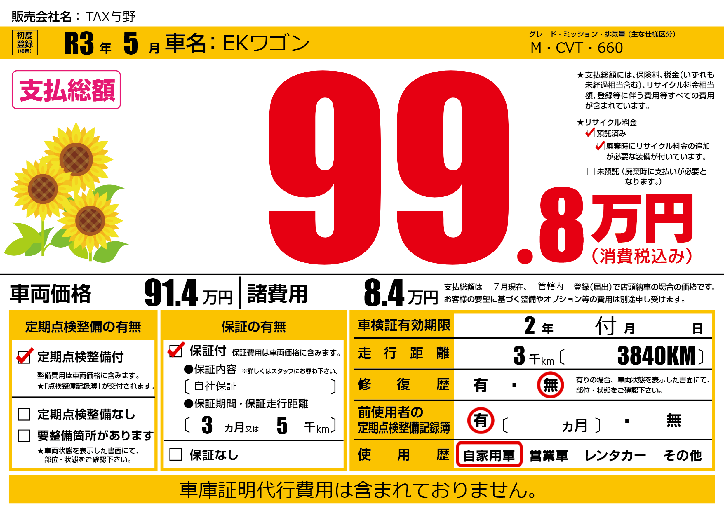 | 車名 | EKワゴン | グレード ミッション 排気量 |