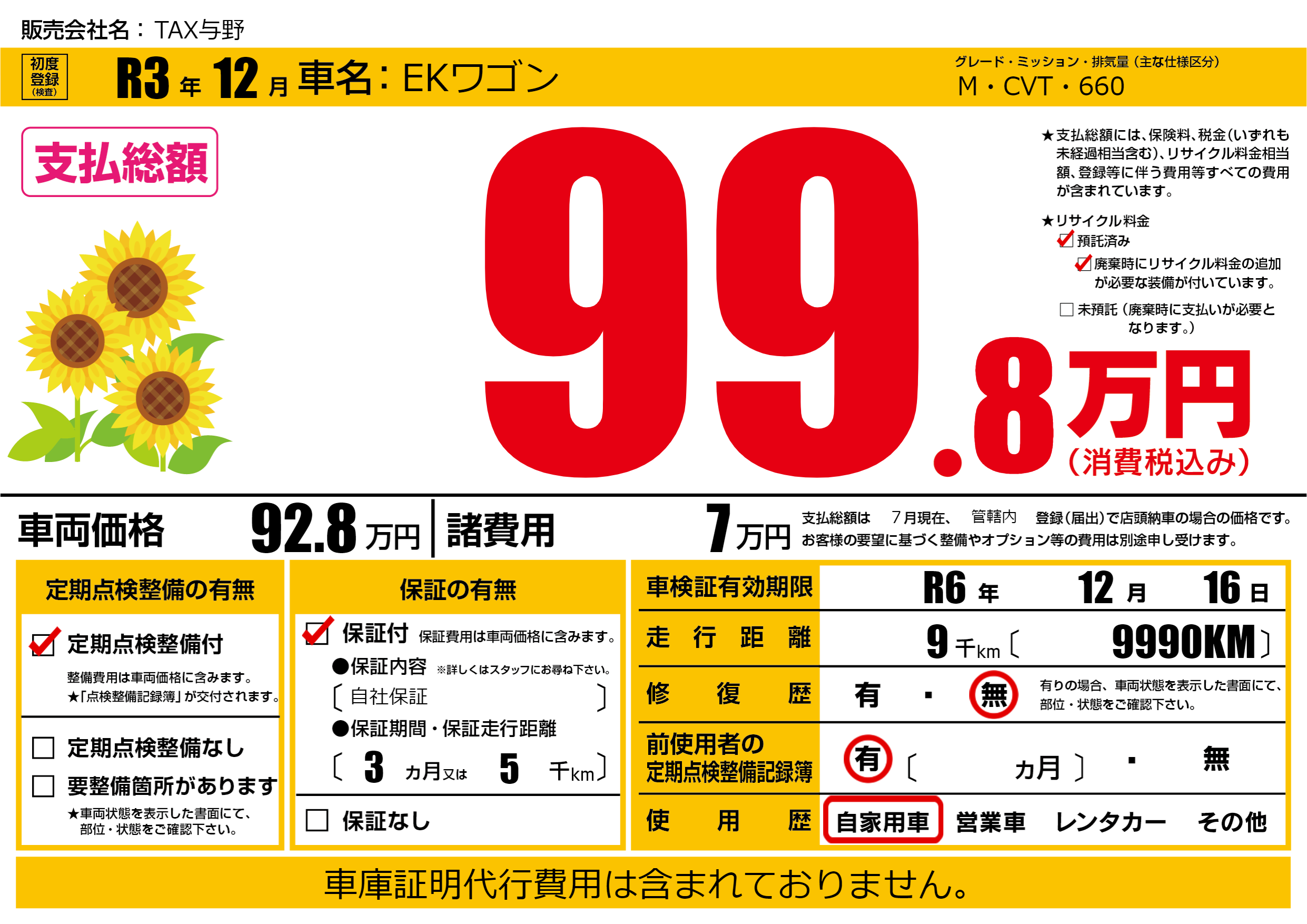 | 車名 | EKワゴン | グレード ミッション 排気量 |