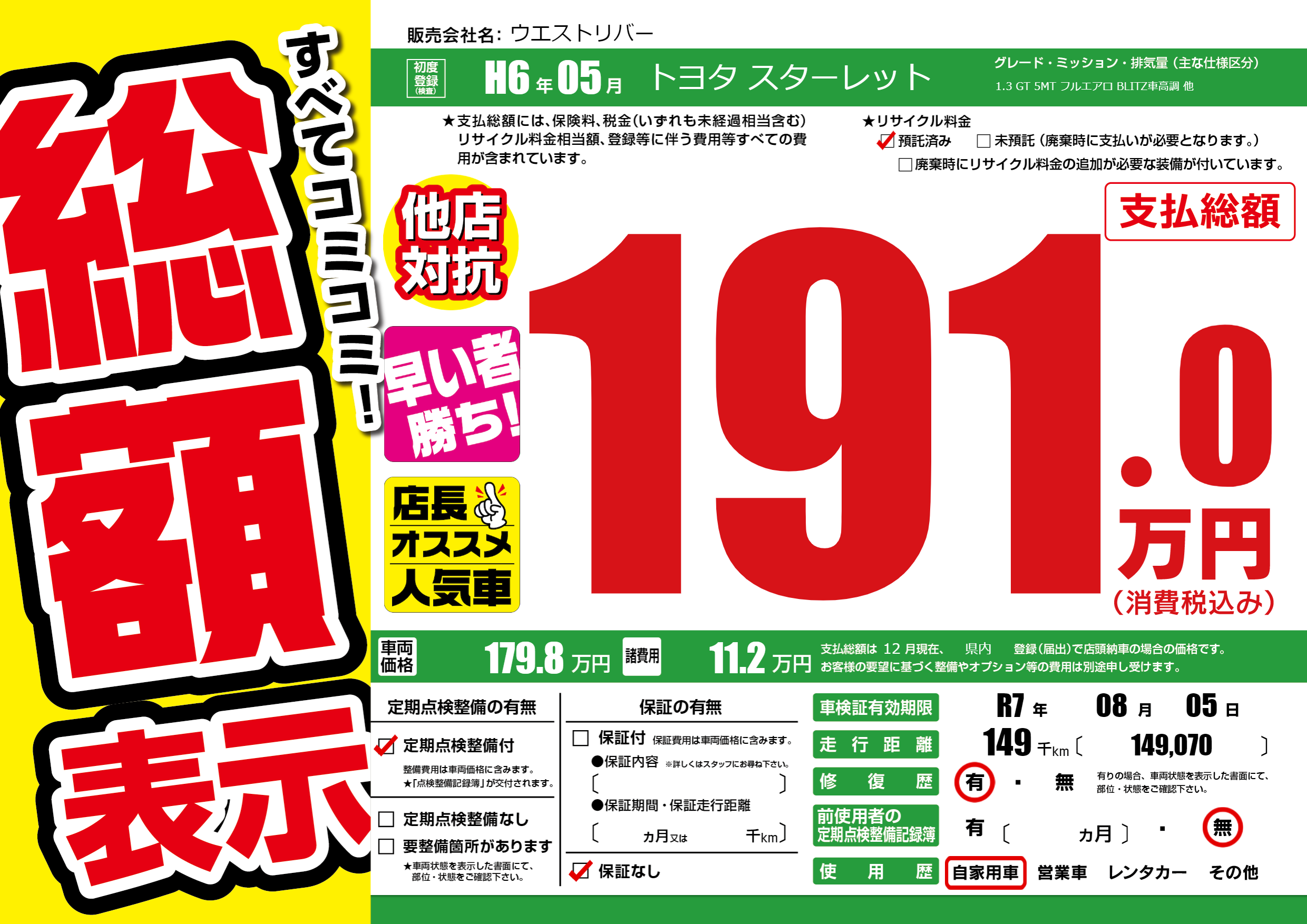 | 車名 | トヨタ スターレット | グレード ミッション 排気量 |