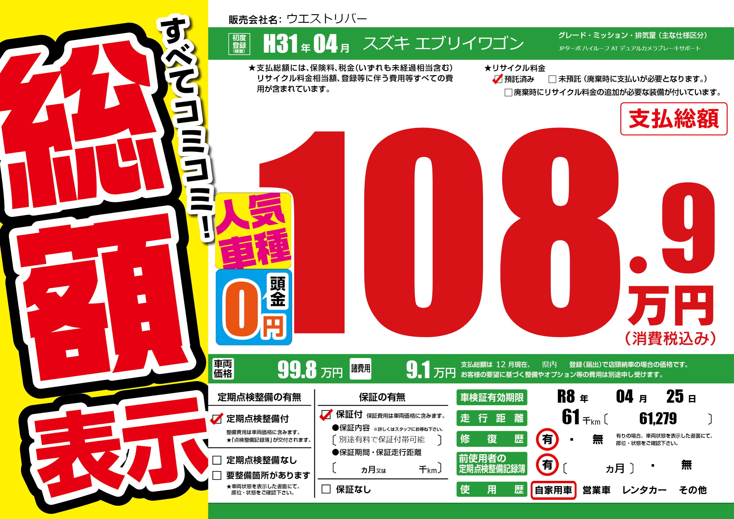 | 車名 | スズキ エブリイワゴン | グレード ミッション 排気量 |