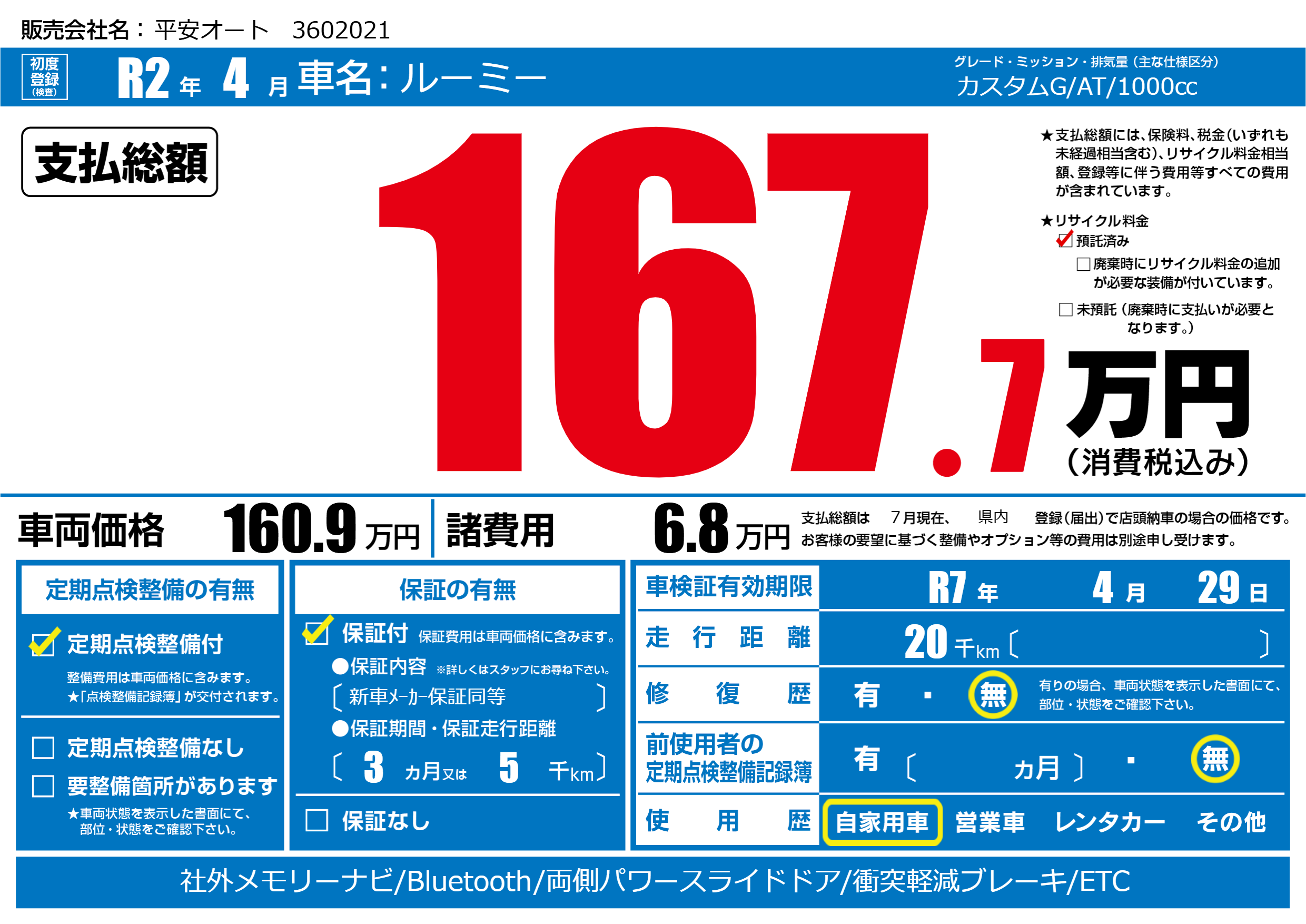 | 車検制限 | R7年 4月 29日 | ||