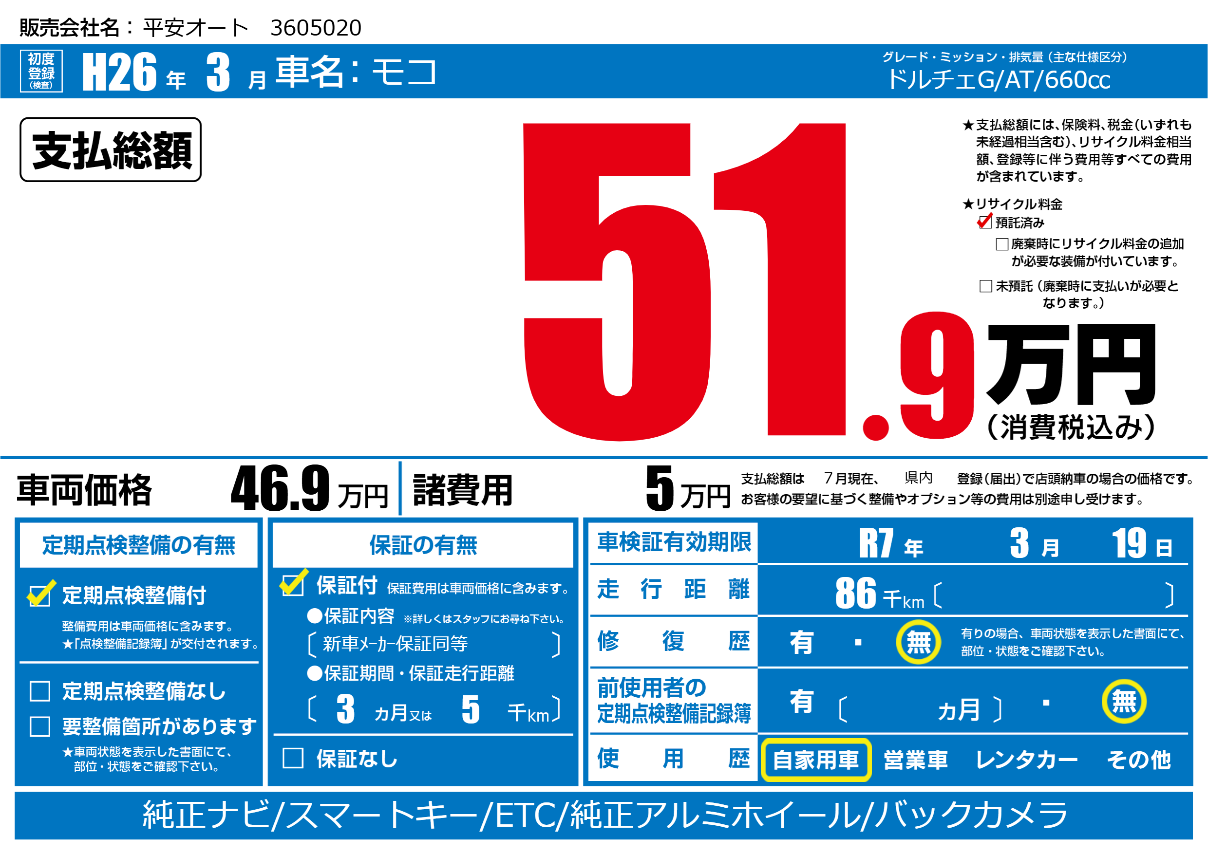 | 走行キロ | 8.6万km | 初年度登録 | H26年3月 |