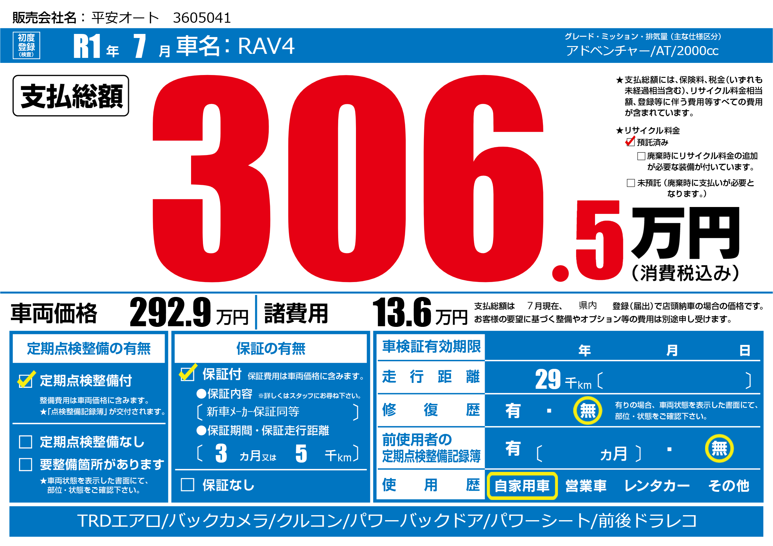 | 走行キロ | 2.9万km | 初年度登録 | R1年7月 |