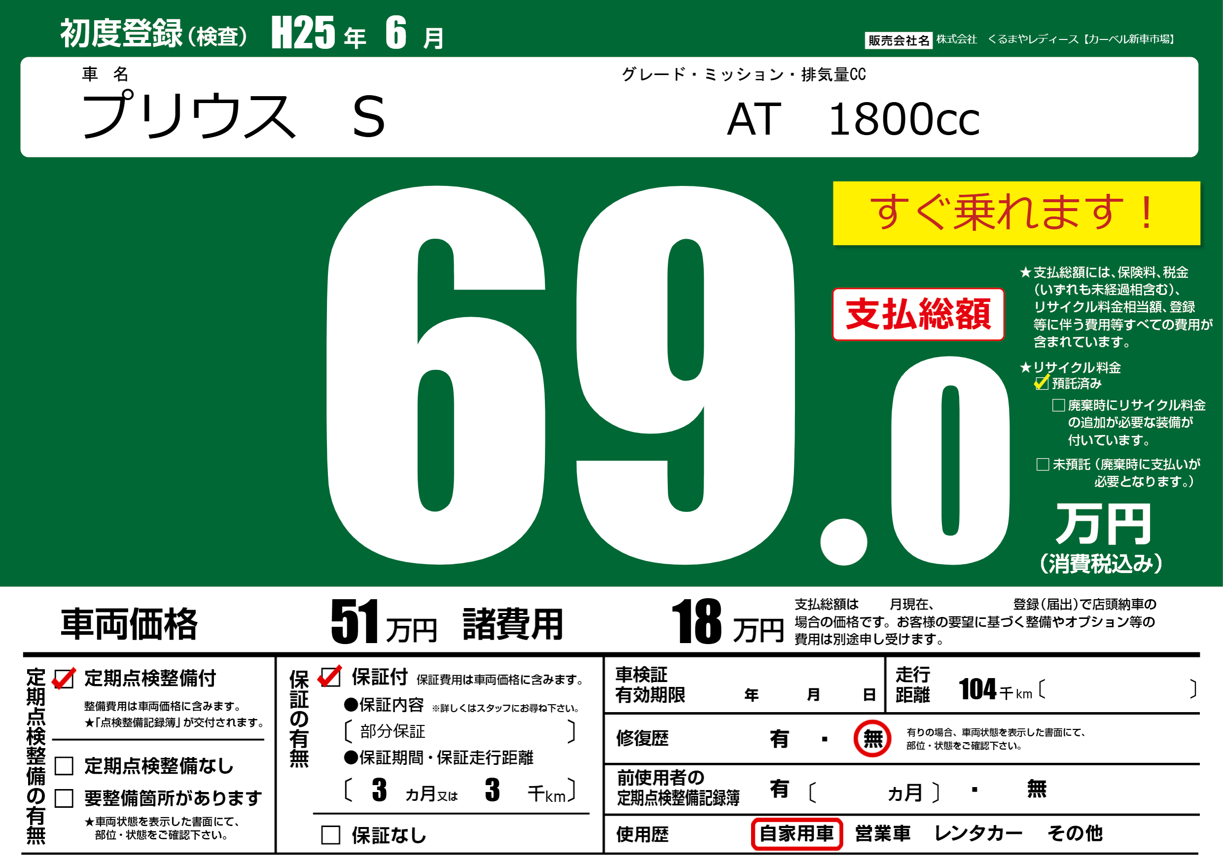 | 車名 | プリウス S | グレード ミッション 排気量 |