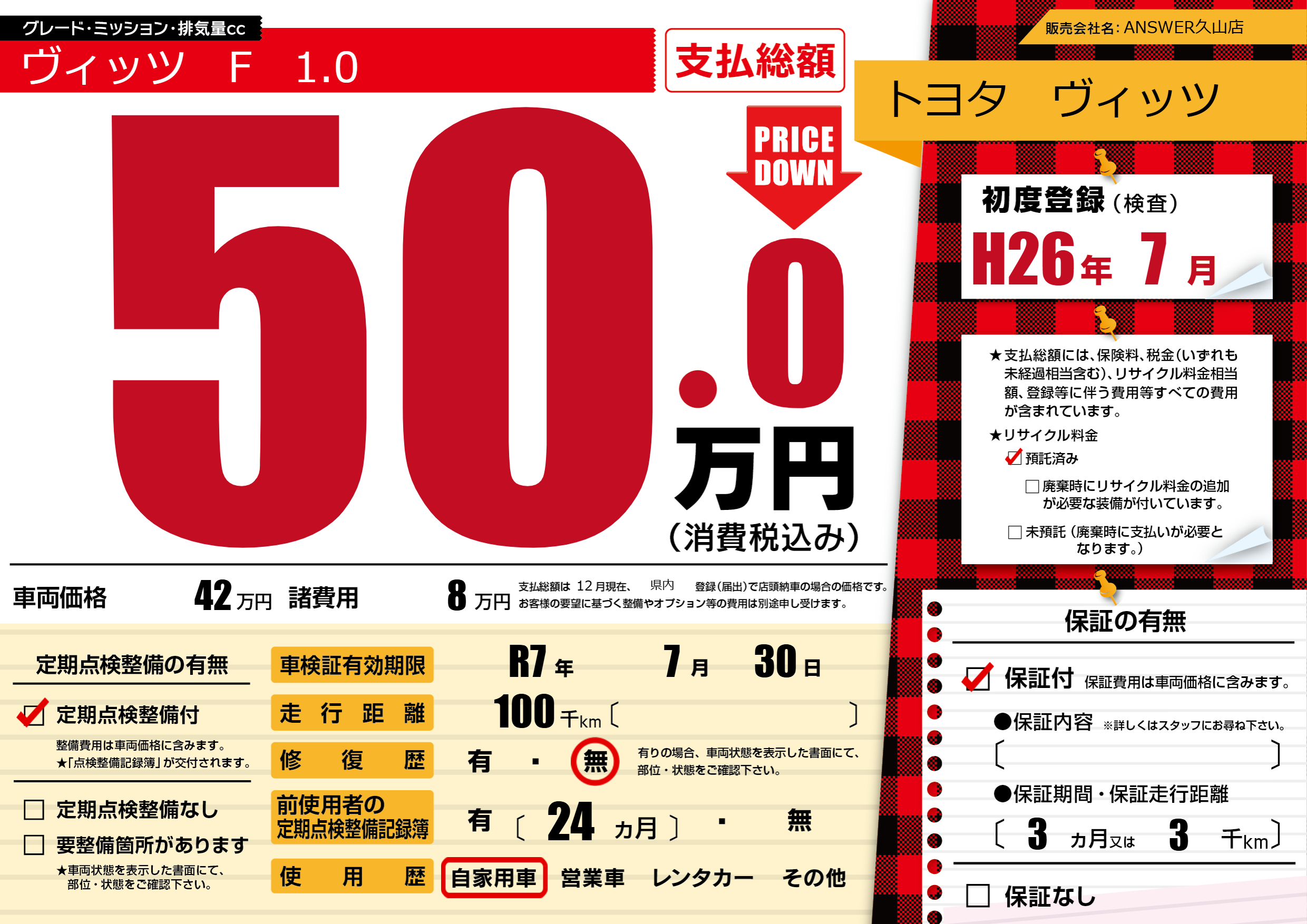 | 走行キロ | 10万km | 初年度登録 | H26年7月 |