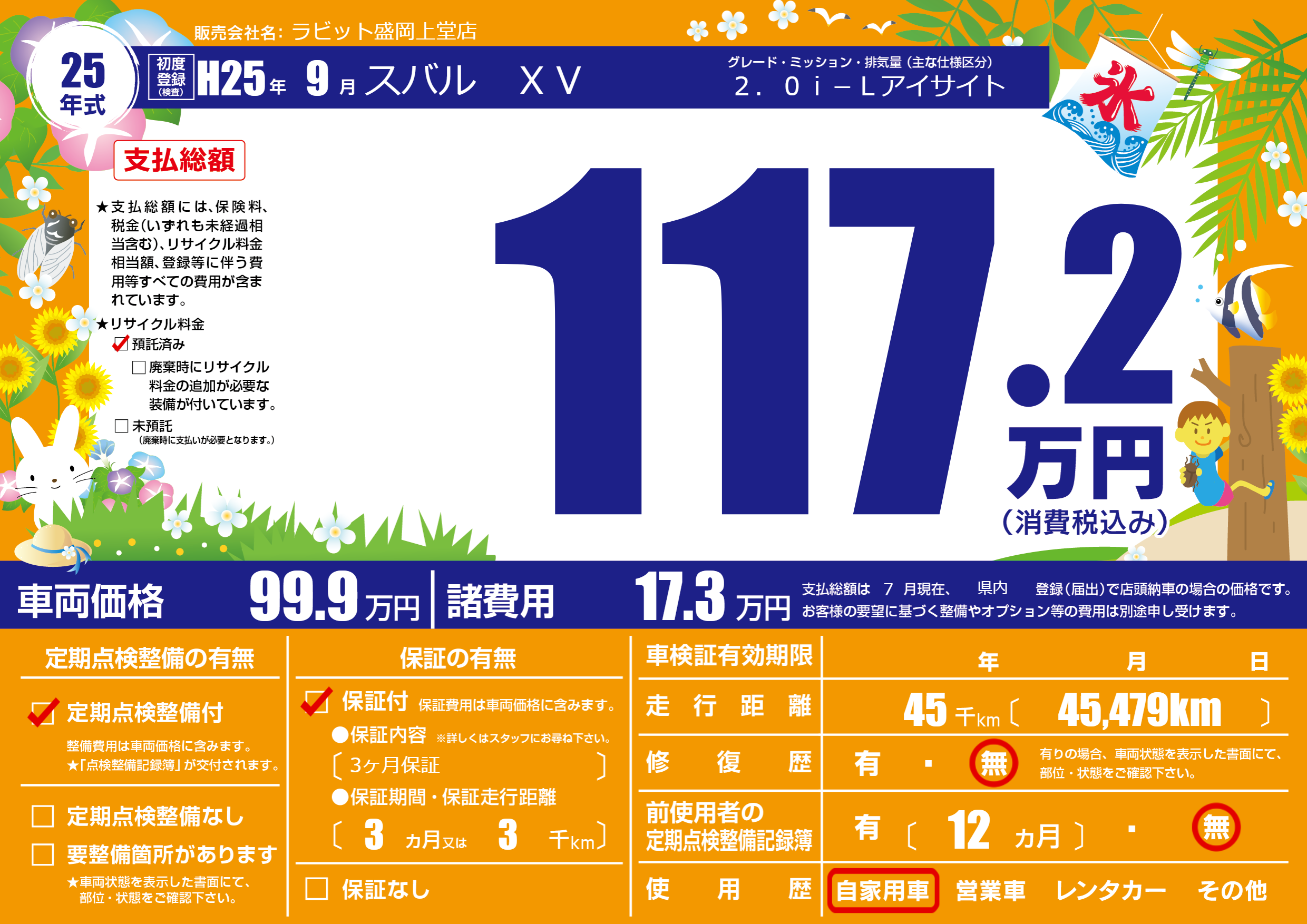 | 車名 | スバル XV | グレード ミッション 排気量 |