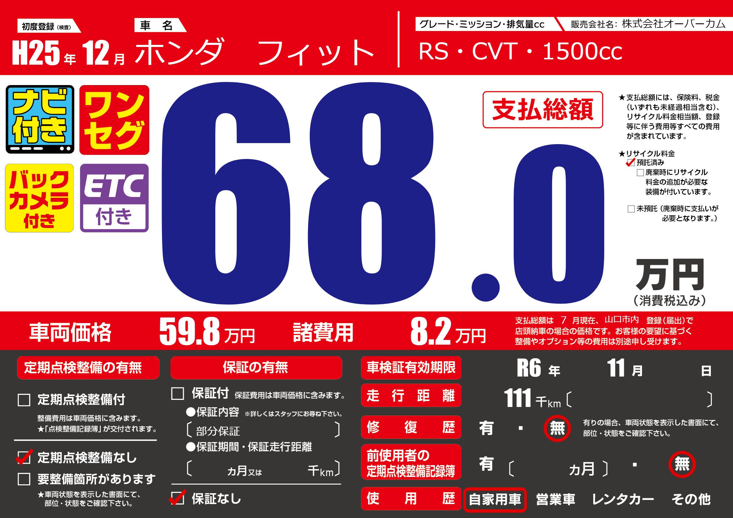| 走行キロ | 11.1万km | 初年度登録 | H25年12月 |