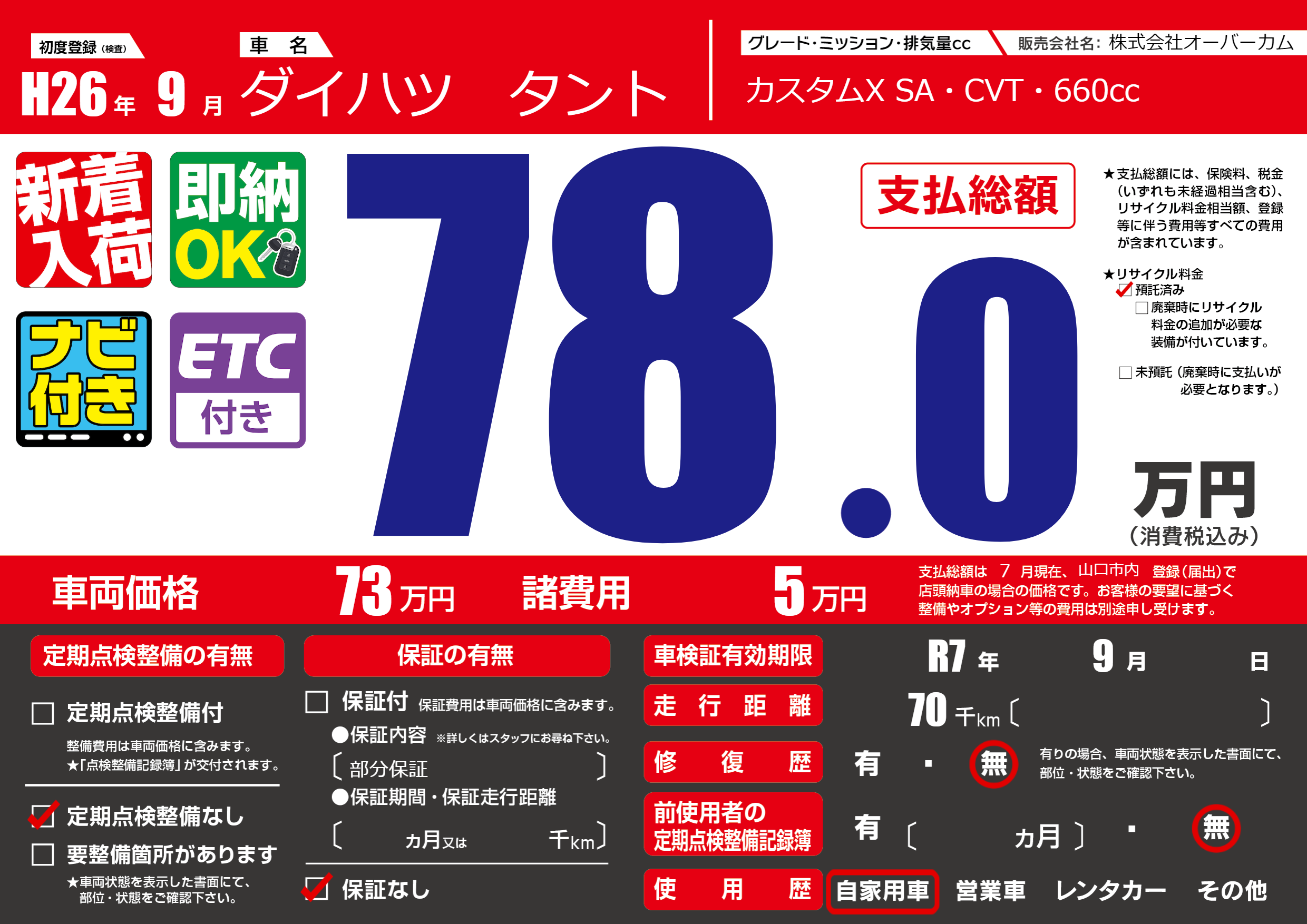 | 走行キロ | 7万km | 初年度登録 | H26年9月 |