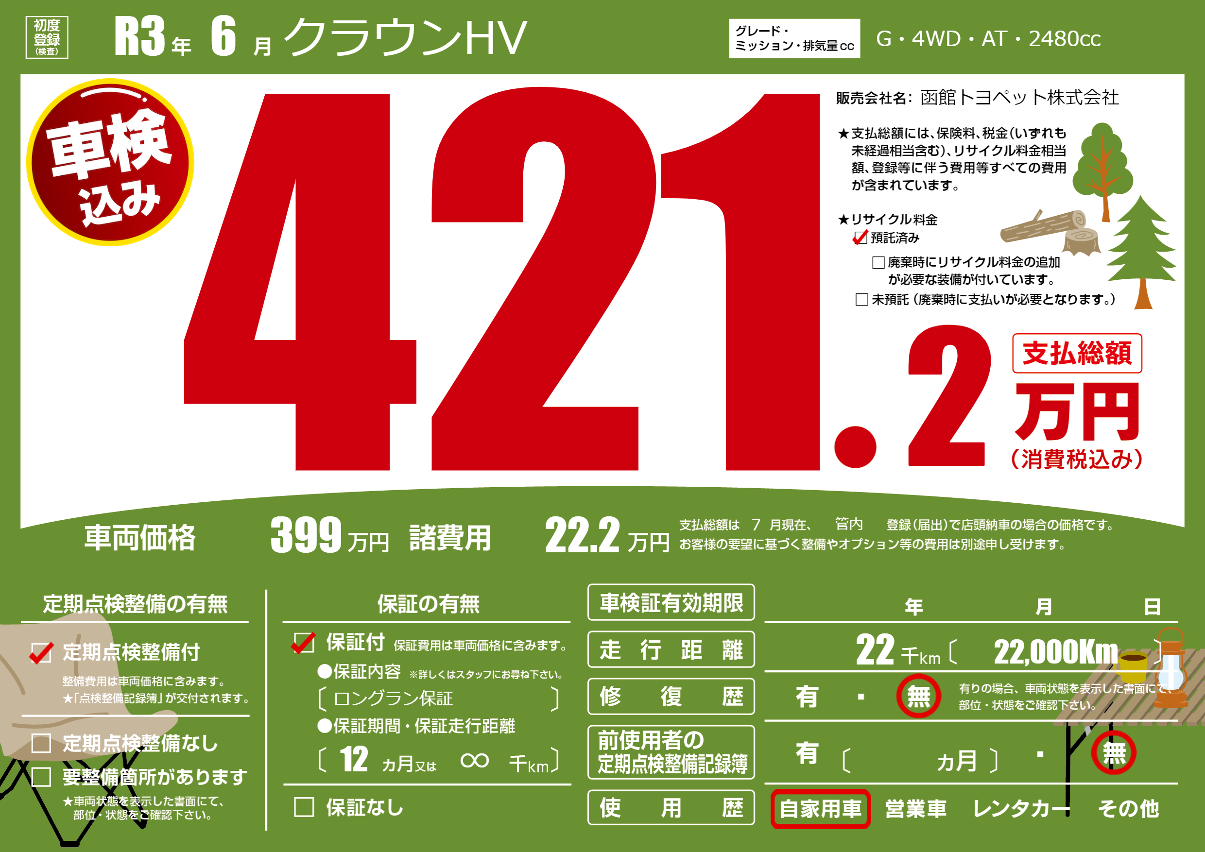 | 走行キロ | 2.2万km | 初年度登録 | R3年6月 |