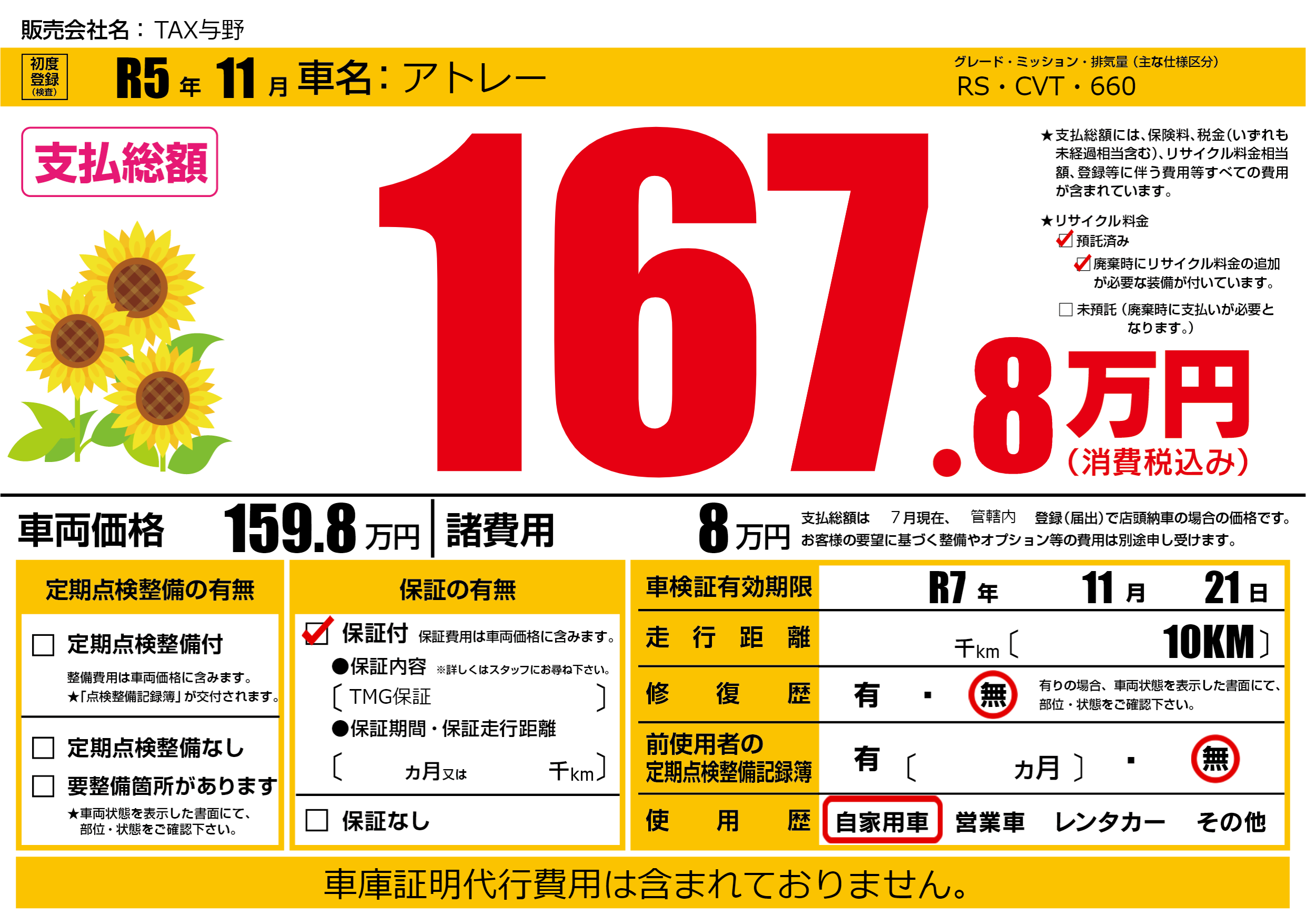 保証付き 保証内容(TMG保証) ---ヶ月または()千kmまで |