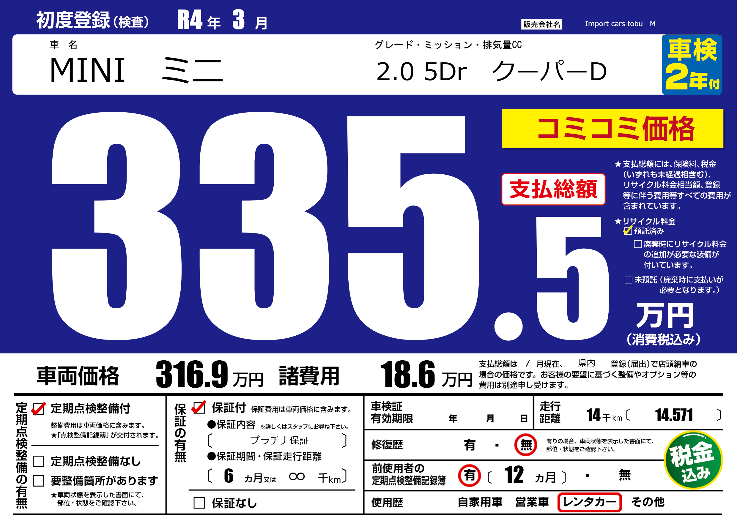 | 車名 | MINI ミニ | グレード ミッション 排気量 |