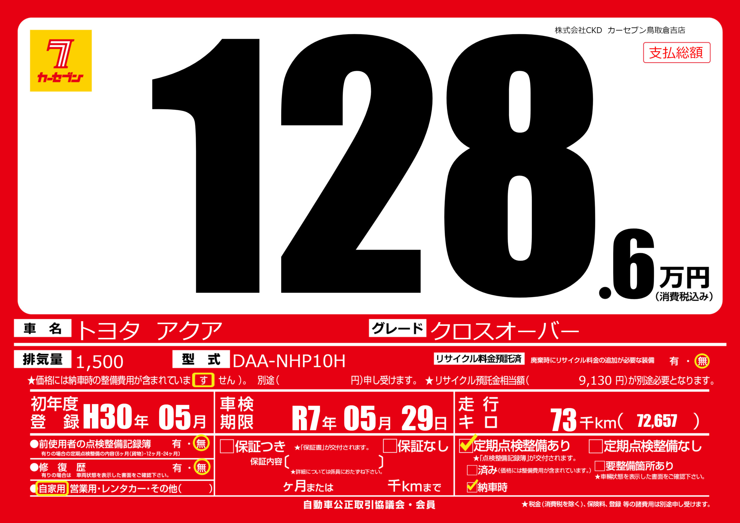 | 走行キロ | 7.3万km | 初年度登録 | H30年05月 |