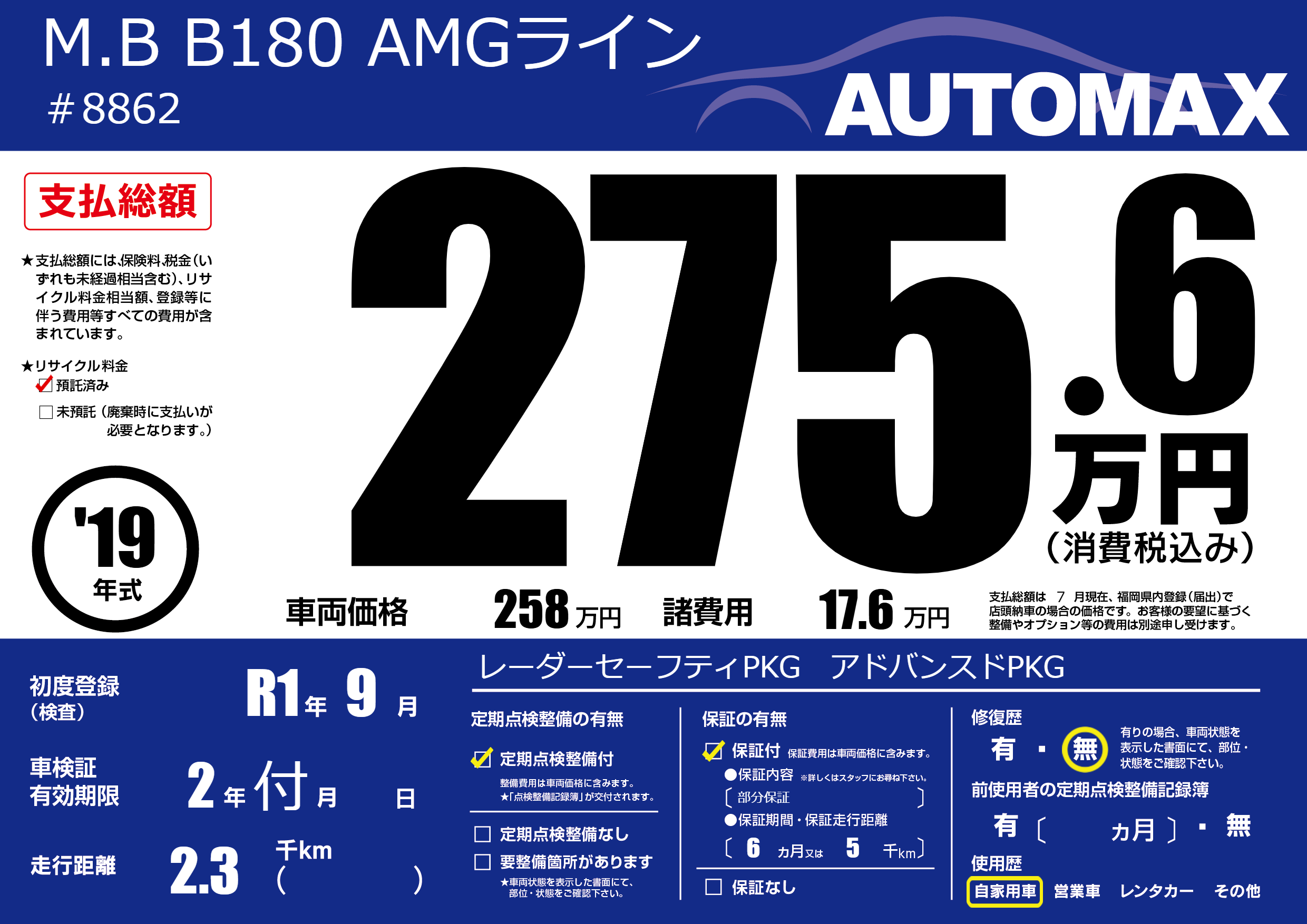 | 車名 | M.B B180 AMGライン | グレード ミッション 排気量 |