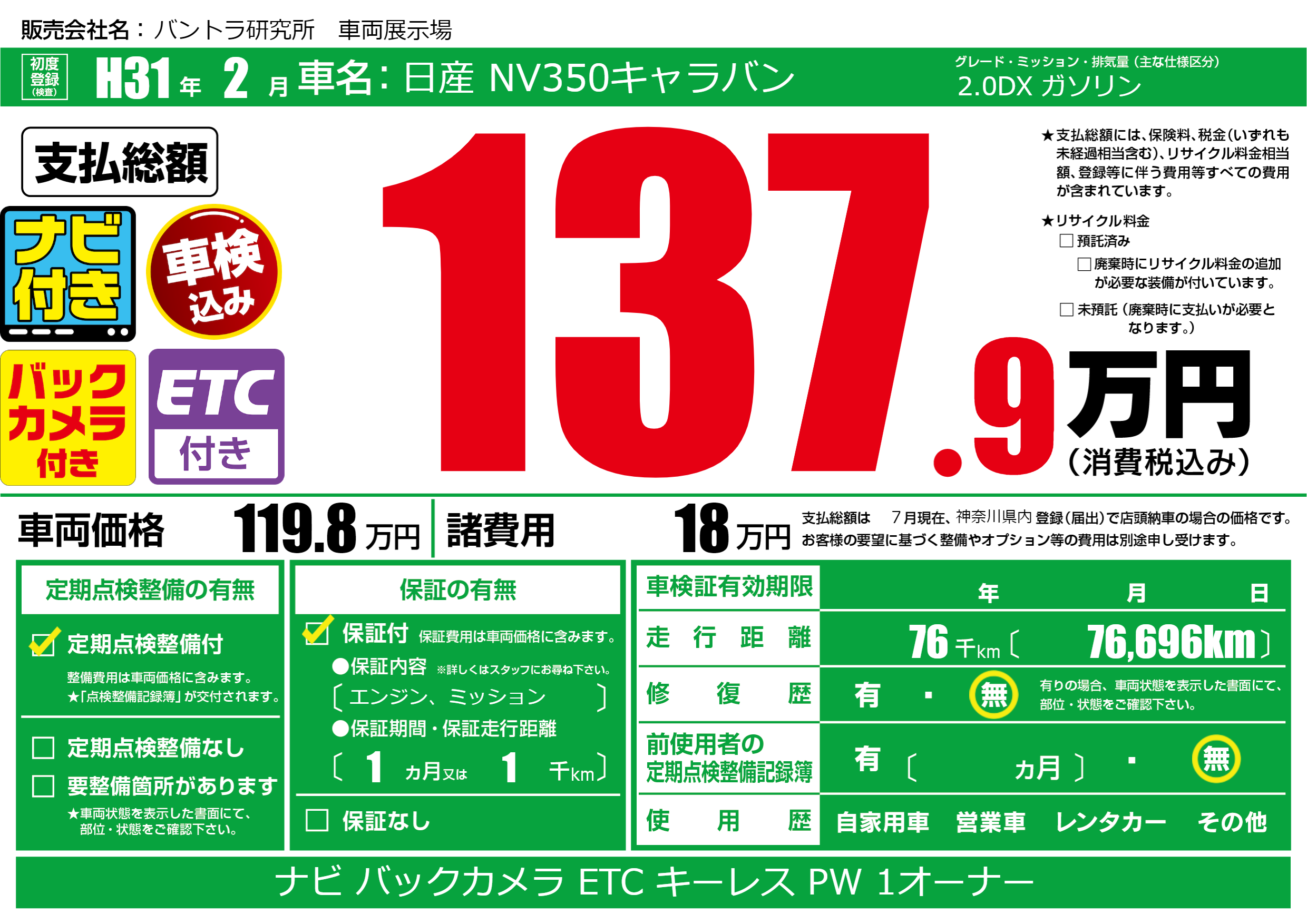 保証内容(エンジン、ミッション) 1ヶ月または1千km