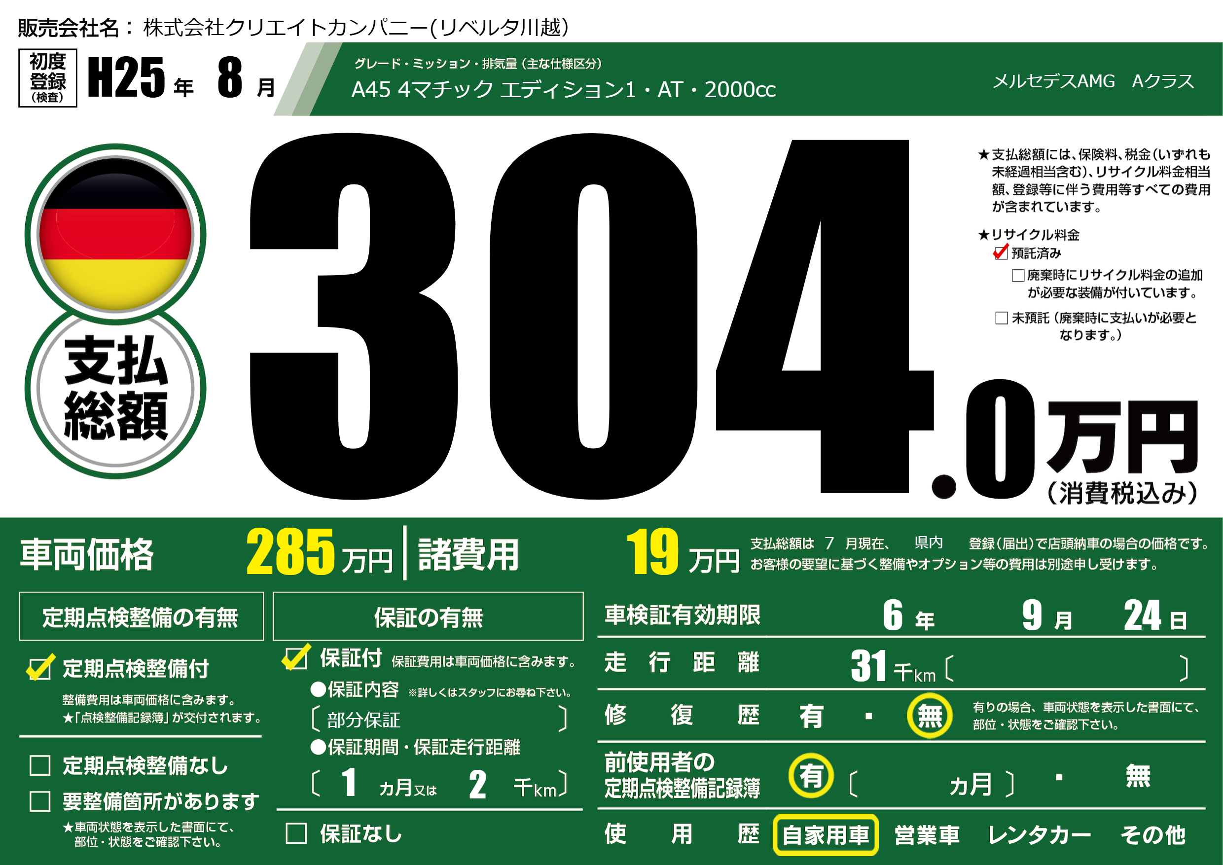 | 車名 | メルセデスAMG Aクラス | グレード ミッション 排気量 |