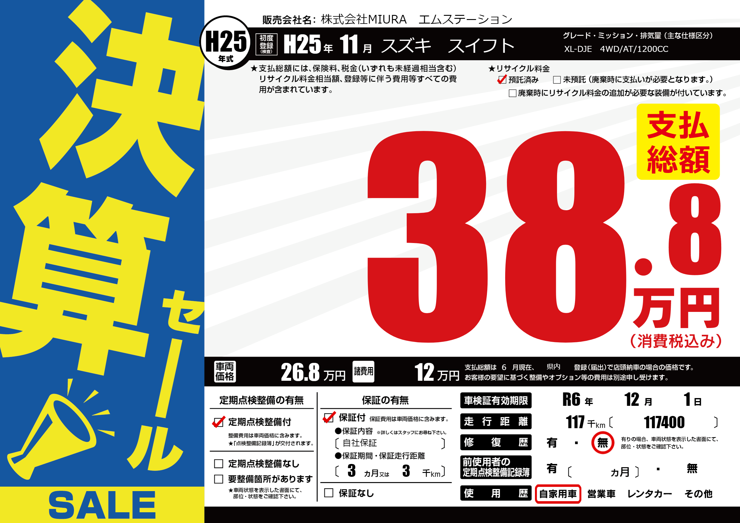 | 車名 | スズキ スイフト | グレード ミッション 排気量 |