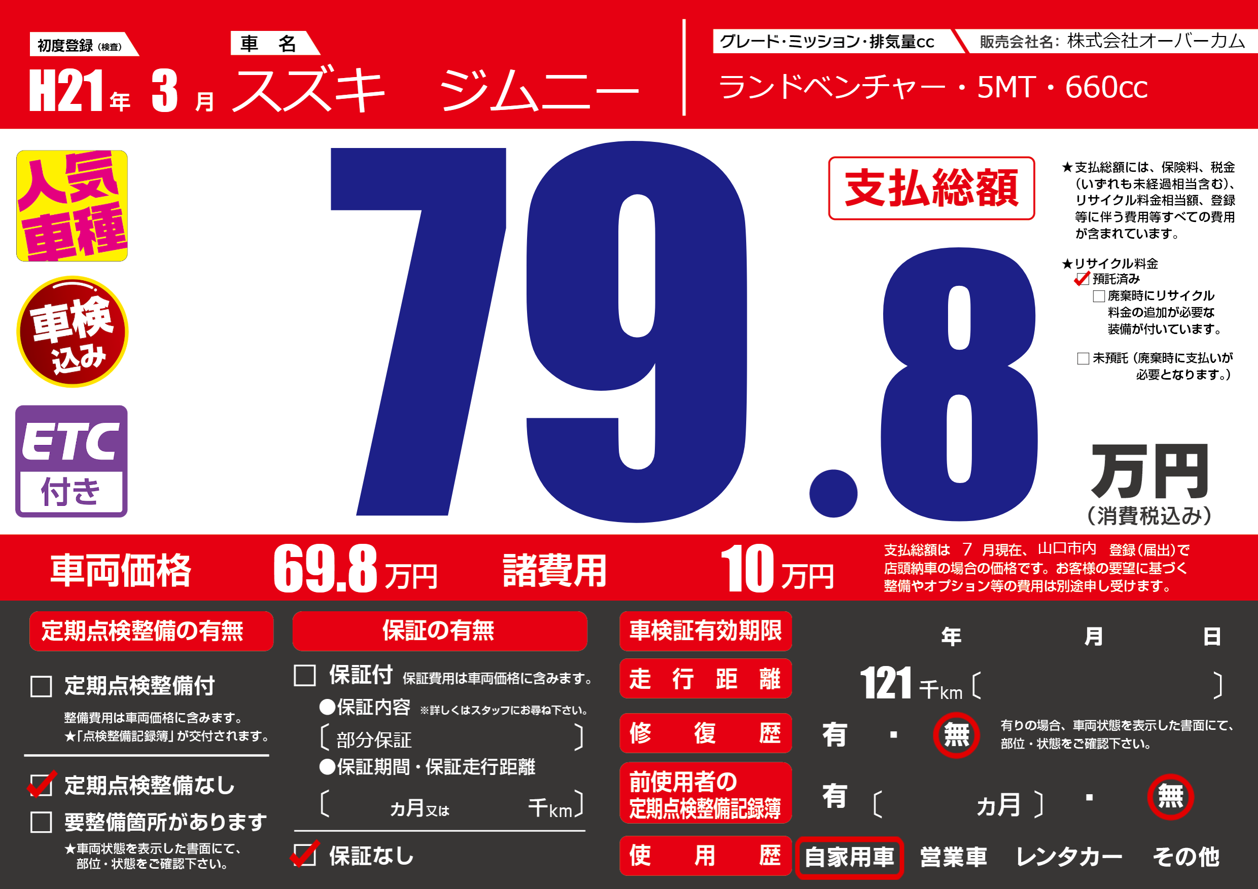 | 走行キロ | 12.1万km | 初年度登録 | H21年3月 |