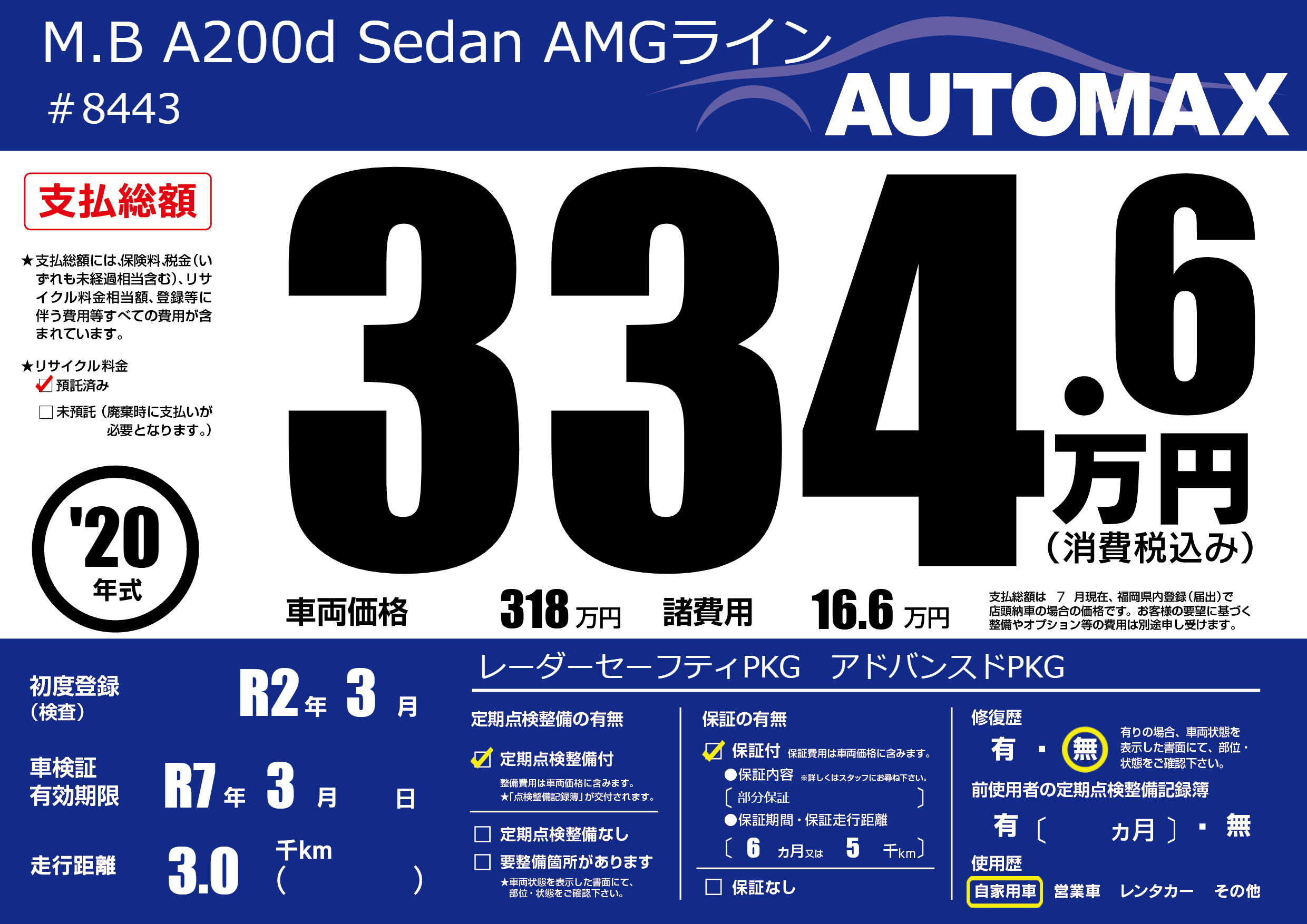 | 車名 | M.B A200d Sedan AMGライン | グレード ミッション 排気量 |