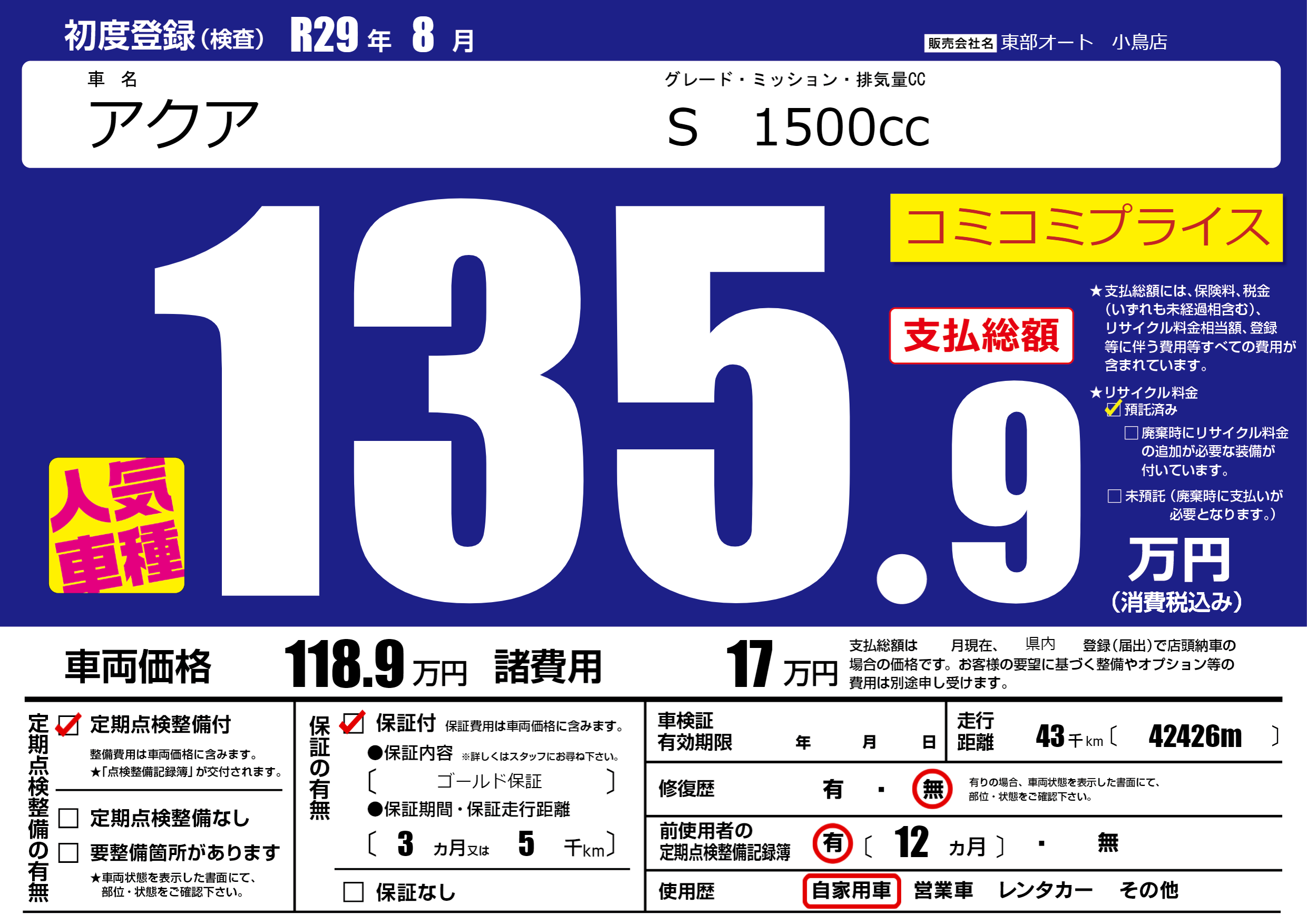 保証付き 保証内容( ゴールド保証) 3ヶ月または(5)千kmまで |
