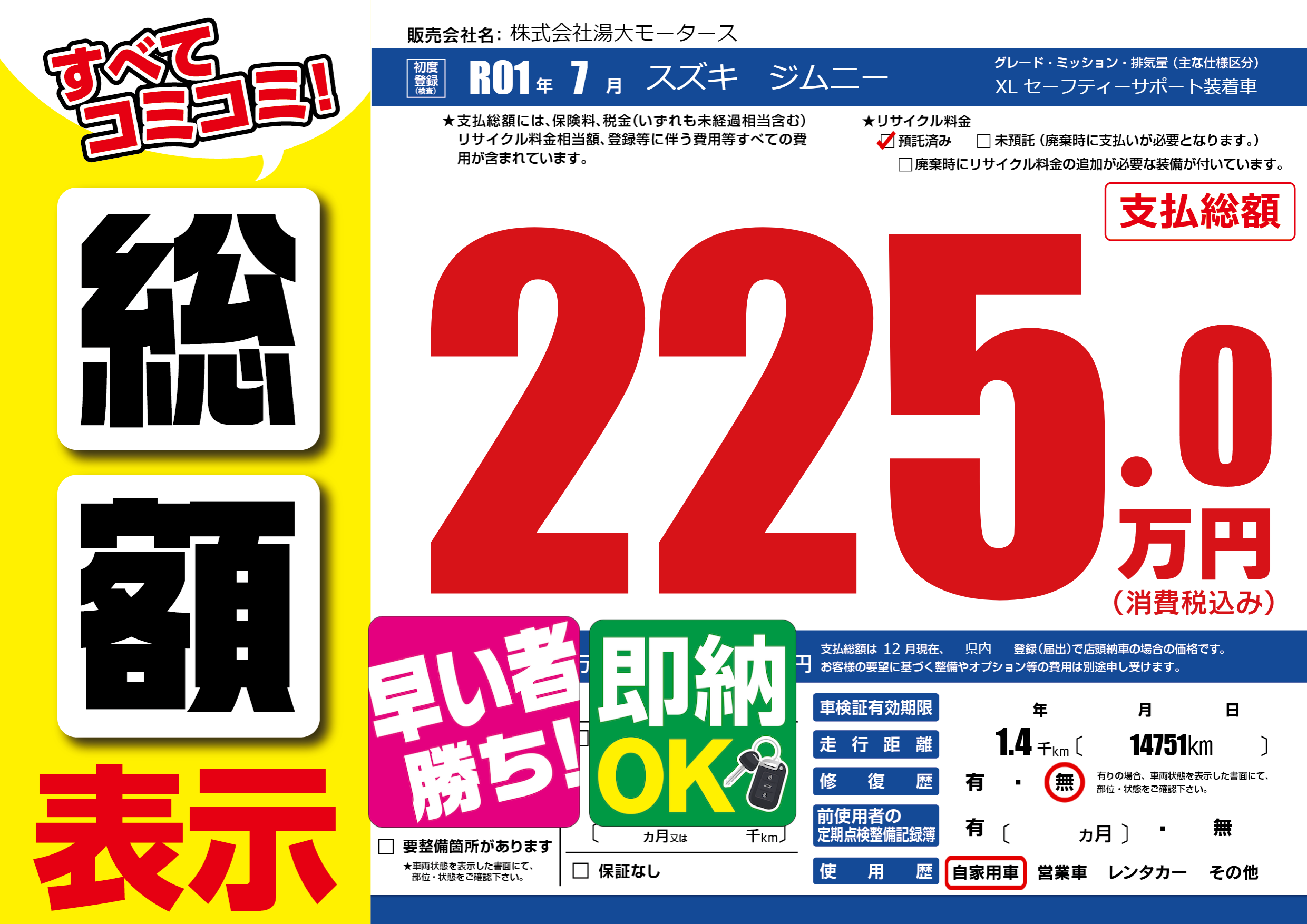 | 車名 | スズキ ジムニー | グレード ミッション 排気量 |